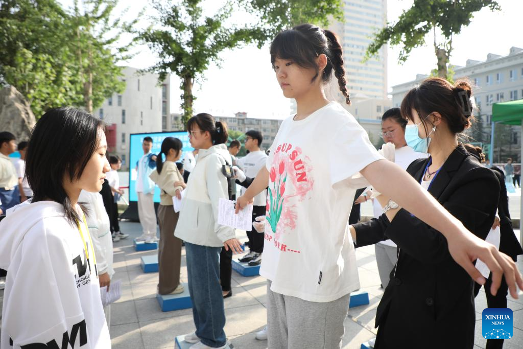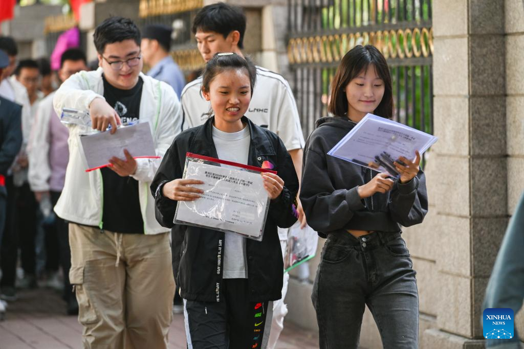 HARBIN, 7 junio, 2024 (Xinhua) -- Aspirantes entran a un sitio del examen nacional de ingreso a la universidad, en Harbin, en la provincia de Heilongjiang, en el noreste de China, el 7 de junio de 2024. El examen nacional de ingreso a la universidad de China, conocido como Gaokao, comenzó el viernes. (Xinhua/Wang Song)