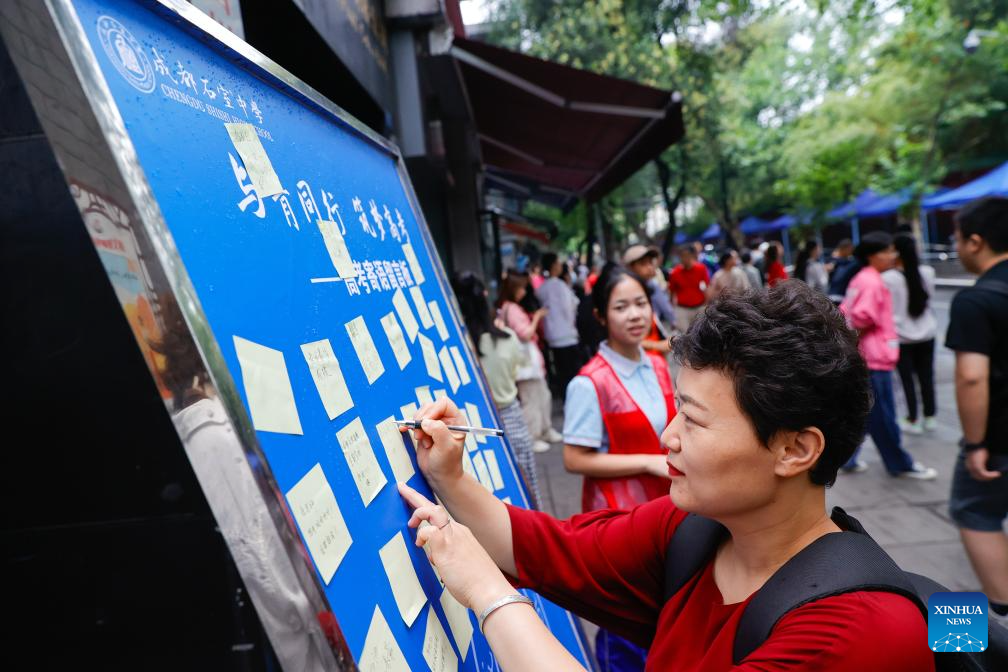 CHENGDU, 7 junio, 2024 (Xinhua) -- Una madre escribe palabras de aliento en una pizarra afuera de un sitio del examen nacional de ingreso a la universidad, en Chengdu, en la provincia de Sichuan, en el suroeste de China, el 7 de junio de 2024. El examen nacional de ingreso a la universidad de China, conocido como Gaokao, comenzó el viernes. (Xinhua/Shen Bohan)