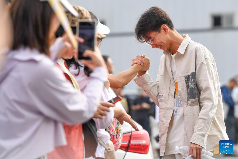 BEIJING, 7 junio, 2024 (Xinhua) -- Un aspirante da la mano a los profesores afuera de un sitio del examen nacional de ingreso a la universidad, en Beijing, capital de China, el 7 de junio de 2024. El examen nacional de ingreso a la universidad de China, conocido como Gaokao, comenzó el viernes. (Xinhua/Ren Chao)