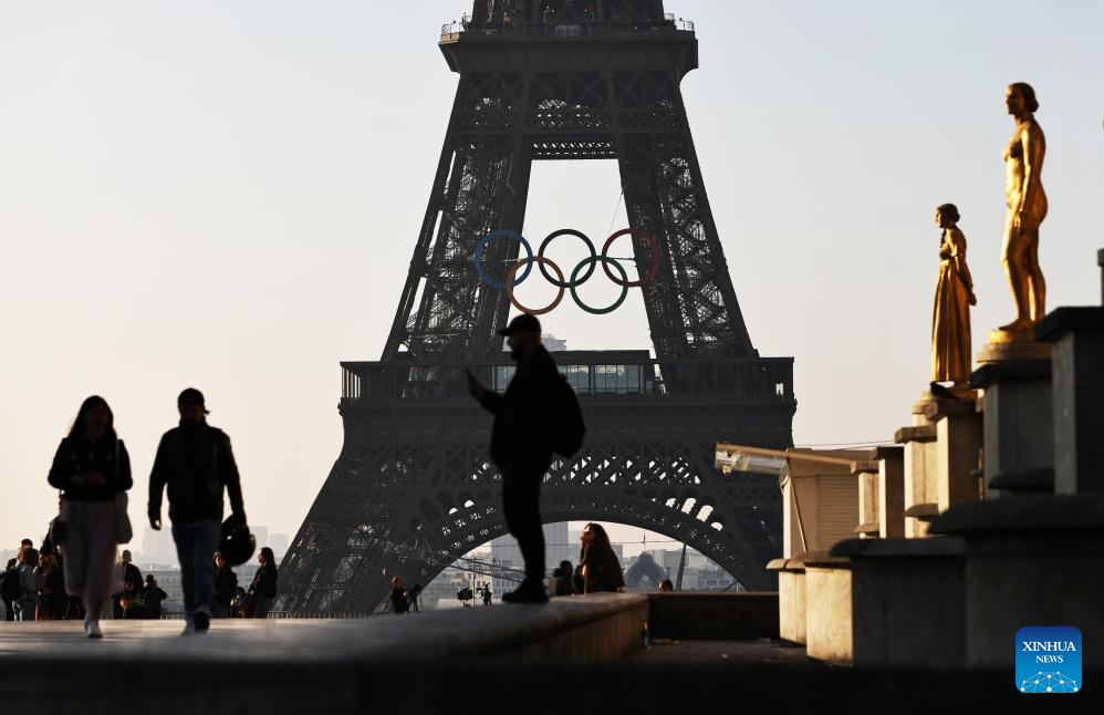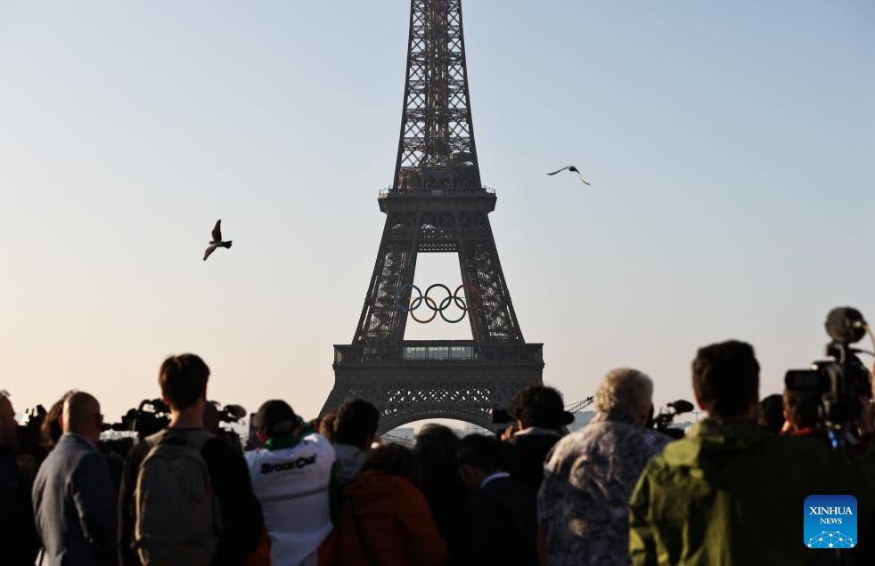 PARIS, 7 junio, 2024 (Xinhua) -- Personas observan los anillos olímpicos en la Torre Eiffel, en París, Francia, el 7 de junio de 2024. Los anillos olímpicos son develados en la Torre Eiffel a primera hora de la mañana del viernes mientras la capital francesa marca 50 días para el inicio de los próximos Juegos Olímpicos de París 2024. (Xinhua/Gao Jing)