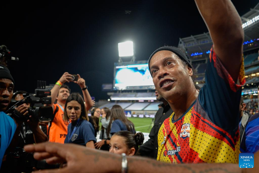 CARACAS, 7 junio, 2024 (Xinhua) -- Imagen del 6 de junio de 2024 del exfutbolista brasileño, Ronaldinho (c), de Forum Jet, saludando a los aficionados al término del partido correspondiente a la Liga Monumental de Venezuela, ante Vikingos del Caribe, celebrado en el Estadio Monumental de Caracas Simón Bolívar, en Caracas, Venezuela. (Xinhua/Marcos Salgado)