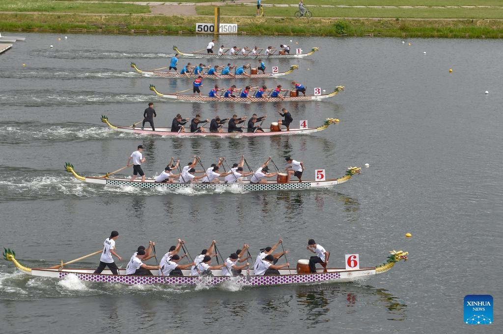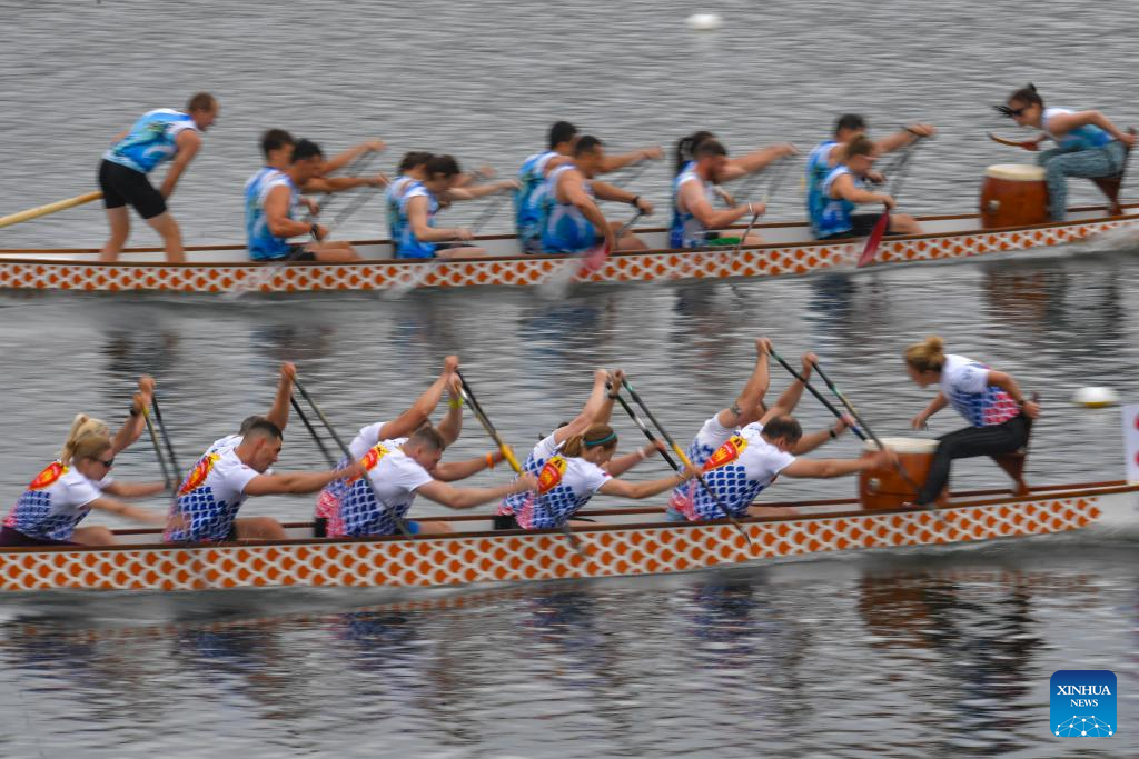 MOSCÚ, 8 junio, 2024 (Xinhua) -- Imagen del 7 de junio de 2024 de equipos compitiendo durante el campeonato de botes dragón de Rusia, en Moscú, Rusia. (Xinhua/Alexander Zemlianichenko Jr)
