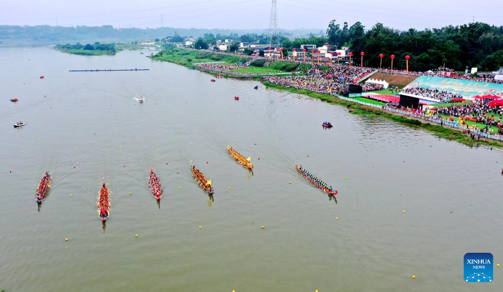 BEIJING, 8 junio, 2024 (Xinhua) -- Vista aérea tomada con un dron el 8 de junio de 2024 de equipos compitiendo durante una carrera de botes del dragón, en la ciudad de Meishan, en la provincia de Sichuan, en el suroeste de China. Para celebrar el próximo Duanwu, o Festival del Bote del Dragón, se celebraron carreras de botes del dragón en varios lugares en China. El festival se celebra el quinto día del quinto mes del calendario lunar chino para conmemorar al antiguo poeta chino, Qu Yuan, del Período de los Reinos Combatientes (475-221 a.C.). (Xinhua/Yao Yongliang)