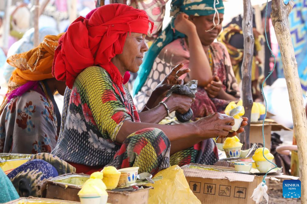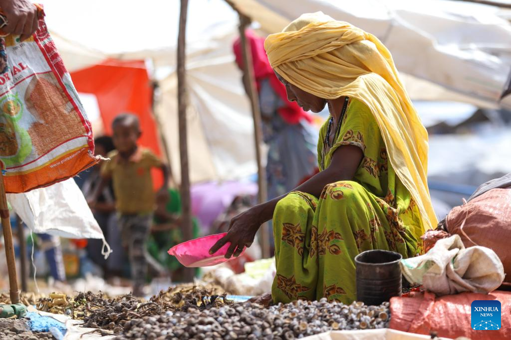ADIS ABEBA, 7 junio, 2024 (Xinhua) -- Imagen del 27 de mayo de 2024 de una vendedora ocupándose de su negocio en un mercado, en Bati, Etiopía. (Xinhua/Michael Tewelde)