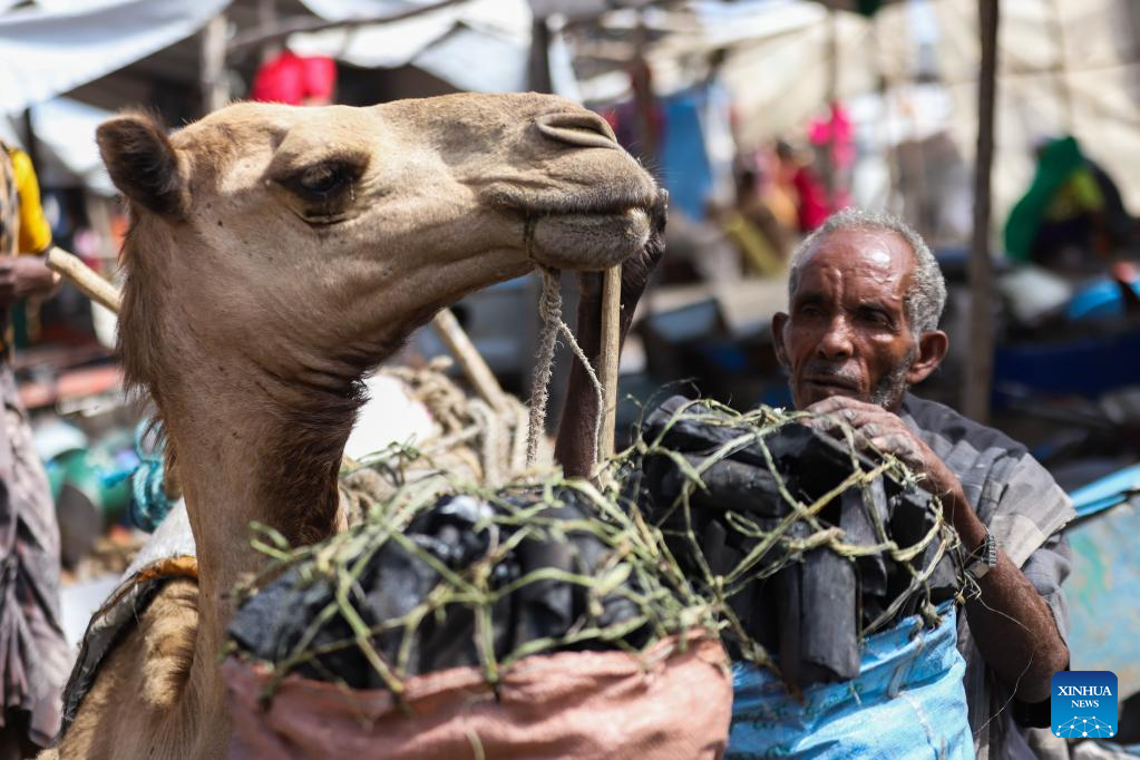 ADIS ABEBA, 7 junio, 2024 (Xinhua) -- Imagen del 27 de mayo de 2024 de un camello transportando mercancías en un mercado, en Bati, Etiopía. (Xinhua/Michael Tewelde)