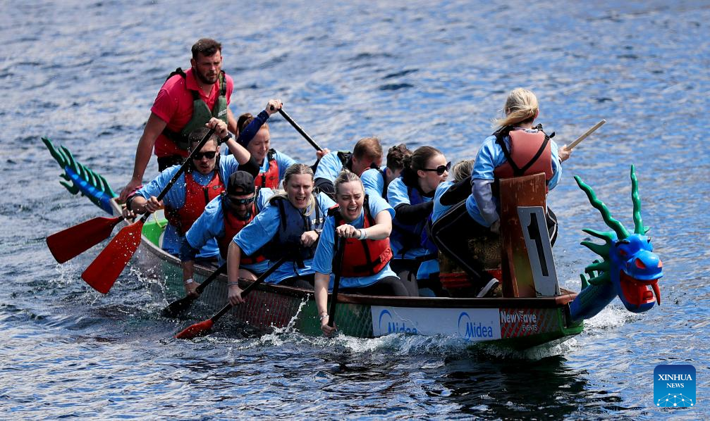 SALFORD, 9 junio, 2024 (Xinhua) -- Imagen del 8 de junio de 2024 de equipos compitiendo durante el Festival Chino del Bote del Dragón, en Salford, Reino Unido. (Xinhua/Li Ying)