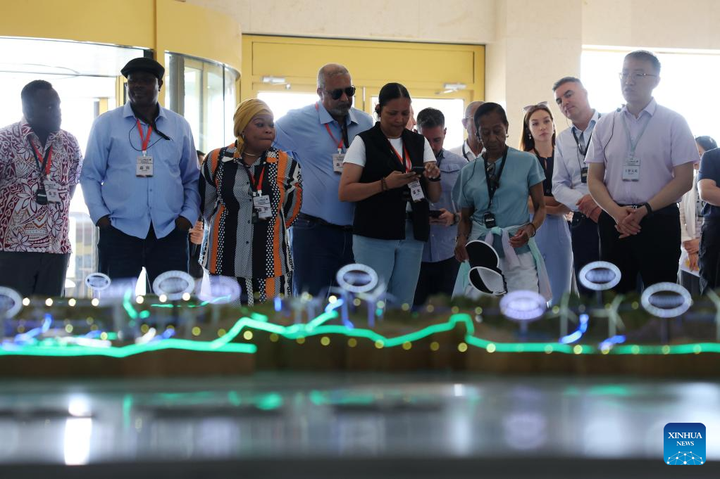 DUNHUANG, 7 junio, 2024 (Xinhua) -- Imagen del 6 de junio de 2024 de enviados visitando una base industrial, en Dunhuang, en la provincia de Gansu, en el noroeste de China. Los enviados de varios países elogiaron los esfuerzos de China por desarrollar tecnologías de energía limpia y perseguir el desarrollo ecológico durante su visita a la provincia de Gansu, en el noroeste de China. Una delegación de embajadores y diplomáticos de alto nivel de más de 20 países, incluidos Madagascar, Jordania, Nepal y Eslovaquia, comenzó su visita el miércoles en Lanzhou, la capital provincial, y viajó el jueves a Dunhuang, una parada importante en la antigua Ruta de la Seda. (Xinhua/Chen Bin)
