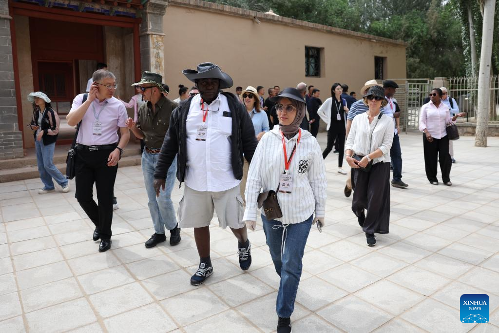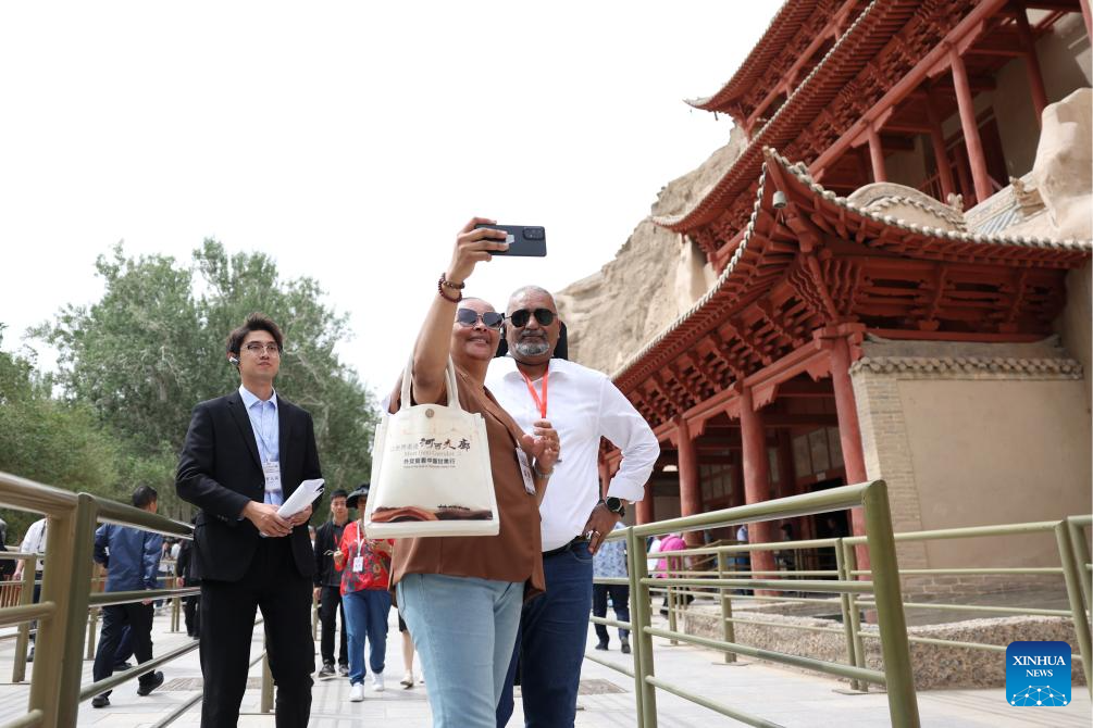 DUNHUANG, 7 junio, 2024 (Xinhua) -- Enviados visitan las Grutas de Mogao, en Dunhuang, en la provincia de Gansu, en el noroeste de China, el 7 de junio de 2024. Los enviados de varios países elogiaron los esfuerzos de China por desarrollar tecnologías de energía limpia y perseguir el desarrollo ecológico durante su visita a la provincia de Gansu, en el noroeste de China. Una delegación de embajadores y diplomáticos de alto nivel de más de 20 países, incluidos Madagascar, Jordania, Nepal y Eslovaquia, comenzó su visita el miércoles en Lanzhou, la capital provincial, y viajó el jueves a Dunhuang, una parada importante en la antigua Ruta de la Seda. (Xinhua/Chen Bin)