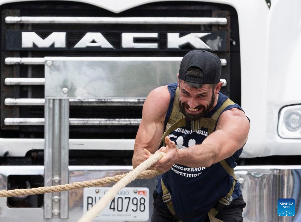 DUNNVILLE, 9 junio, 2024 (Xinhua) -- Imagen del 8 de junio de 2024 de un participante compitiendo durante el desafío de arrastre de camión de la Competencia del Hombre Más Fuerte y la Mujer Más Fuerte en el Festival Mudcat de Dunnville 2024, en Dunnville, Ontario, Canadá. (Xinhua/Zou Zheng)