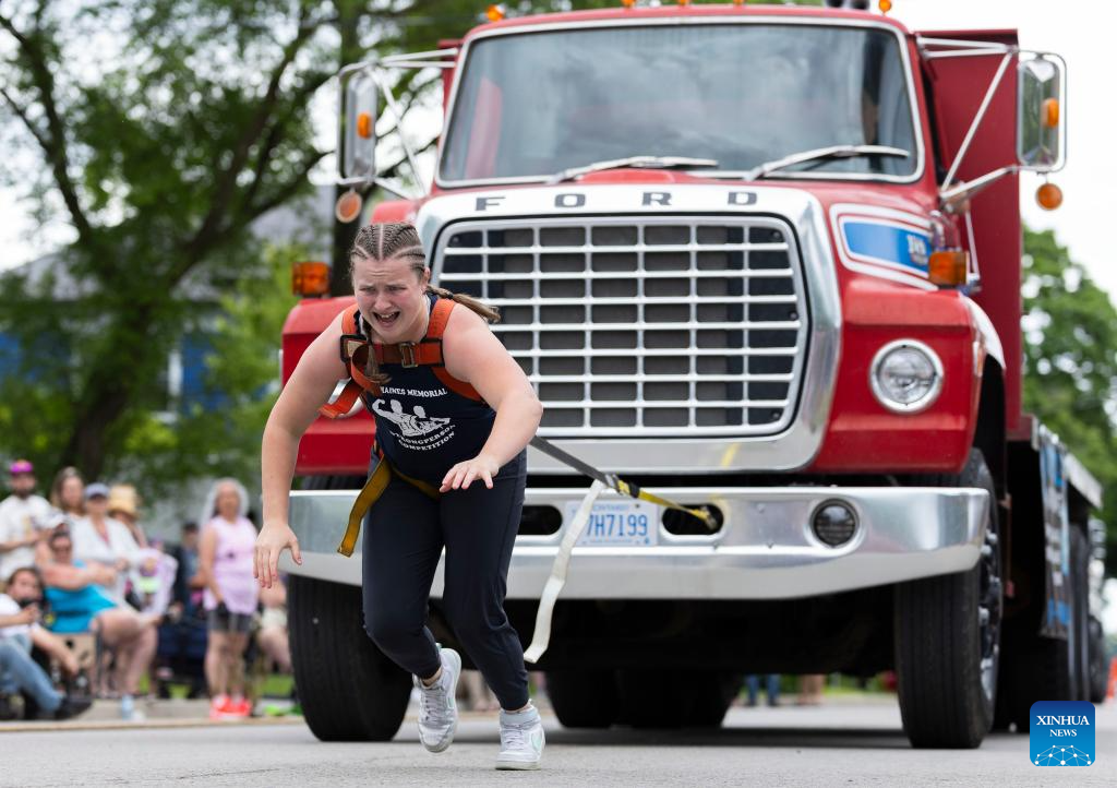 DUNNVILLE, 9 junio, 2024 (Xinhua) -- Imagen del 8 de junio de 2024 de una participante compitiendo durante el desafío de arrastre de camión de la Competencia del Hombre Más Fuerte y la Mujer Más Fuerte en el Festival Mudcat de Dunnville 2024, en Dunnville, Ontario, Canadá. (Xinhua/Zou Zheng)