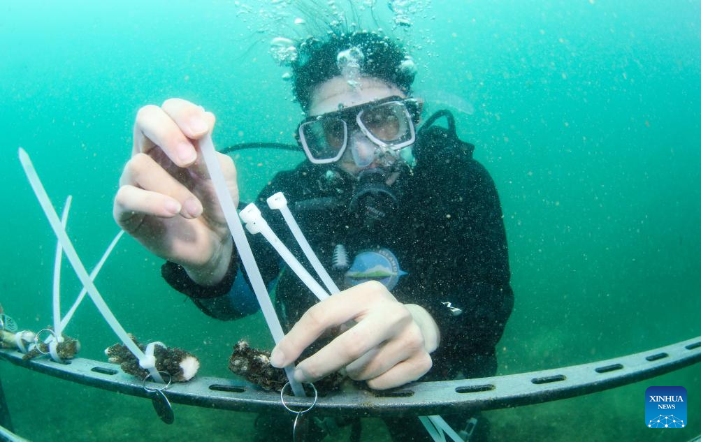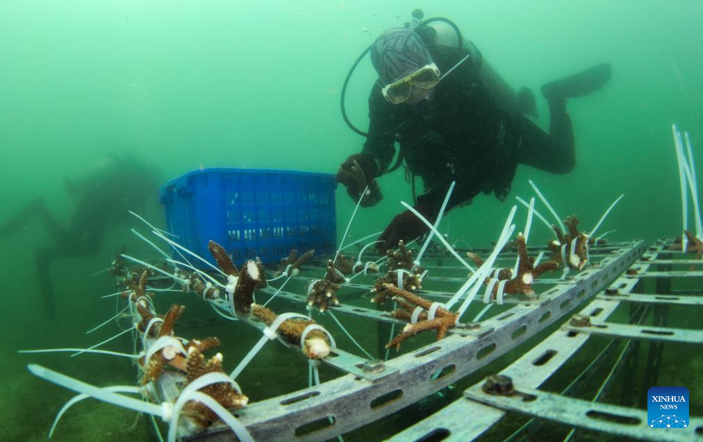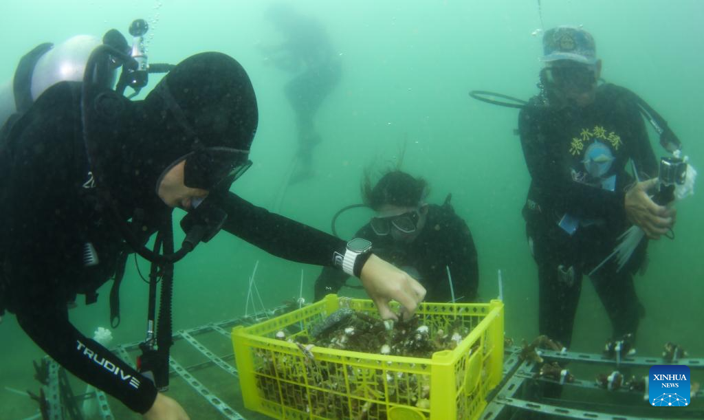 Buzos trasplantan corales en las aguas de la isla de Fenjiezhou de Hainan