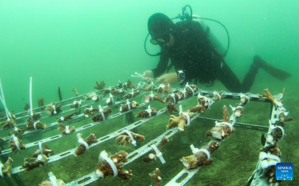 LINGSHUI, 8 junio, 2024 (Xinhua) -- Buzos trasplantan corales en las aguas de la isla de Fenjiezhou de la provincia de Hainan, en el sur de China, el 8 de junio de 2024. El 8 de junio se conmemora el Día Mundial de los Océanos. (Xinhua/Yang Guanyu)