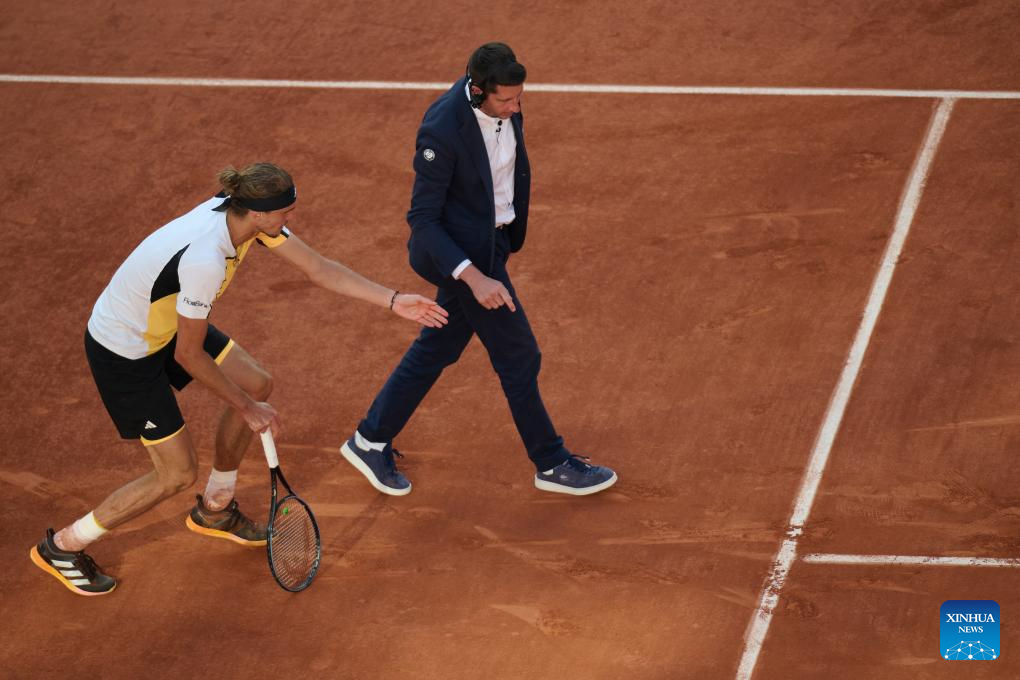 PARIS, 10 junio, 2024 (Xinhua) -- Imagen del 9 de junio de 2024 de Alexander Zverev (i) comunicándose con el árbitro durante el partido de la final de individuales masculinos entre Carlos Alcaraz, de España, y Alexander Zverev, de Alemania, en el torneo de tenis Abierto de Francia en Roland Garros, en París, Francia. (Xinhua/Meng Dingbo)