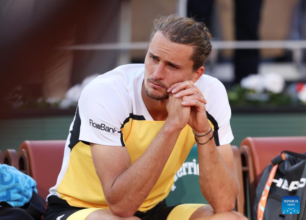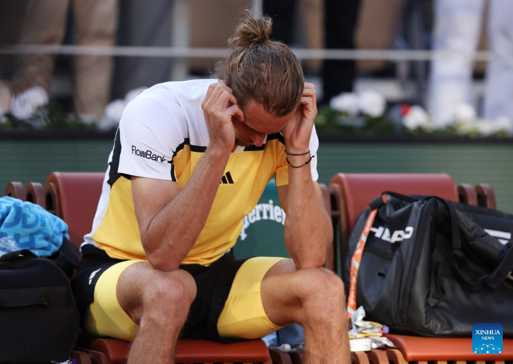 PARIS, 10 junio, 2024 (Xinhua) -- Imagen del 9 de junio de 2024 de Alexander Zverev reaccionando después del partido de la final de individuales masculinos entre Carlos Alcaraz, de España, y Alexander Zverev, de Alemania, en el torneo de tenis Abierto de Francia en Roland Garros, en París, Francia. (Xinhua/Gao Jing)