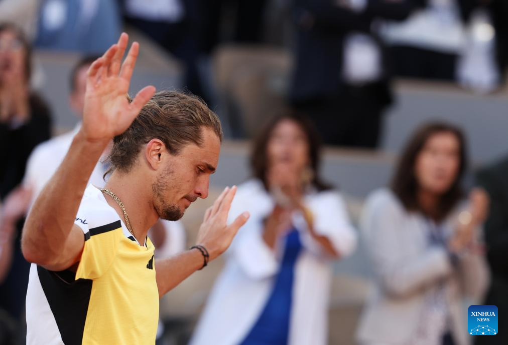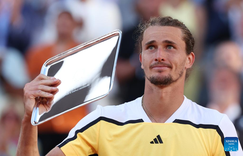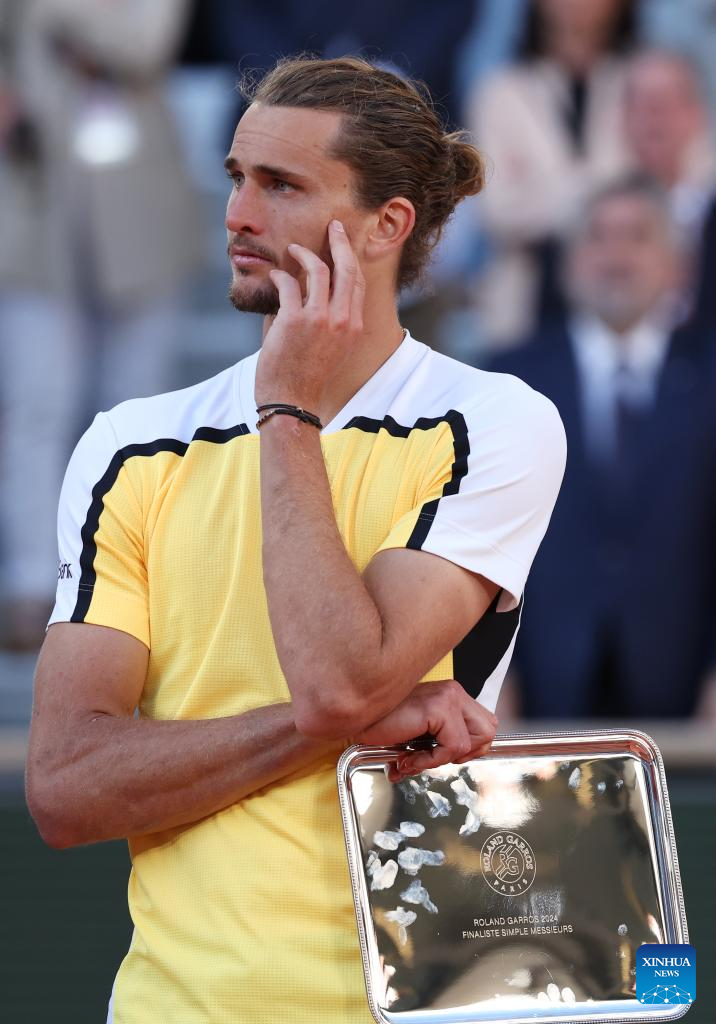 PARIS, 10 junio, 2024 (Xinhua) -- Imagen del 9 de junio de 2024 de Alexander Zverev asistiendo a la ceremonia de premiación después del partido de la final de individuales masculinos entre Carlos Alcaraz, de España, y Alexander Zverev, de Alemania, en el torneo de tenis Abierto de Francia en Roland Garros, en París, Francia. (Xinhua/Gao Jing)