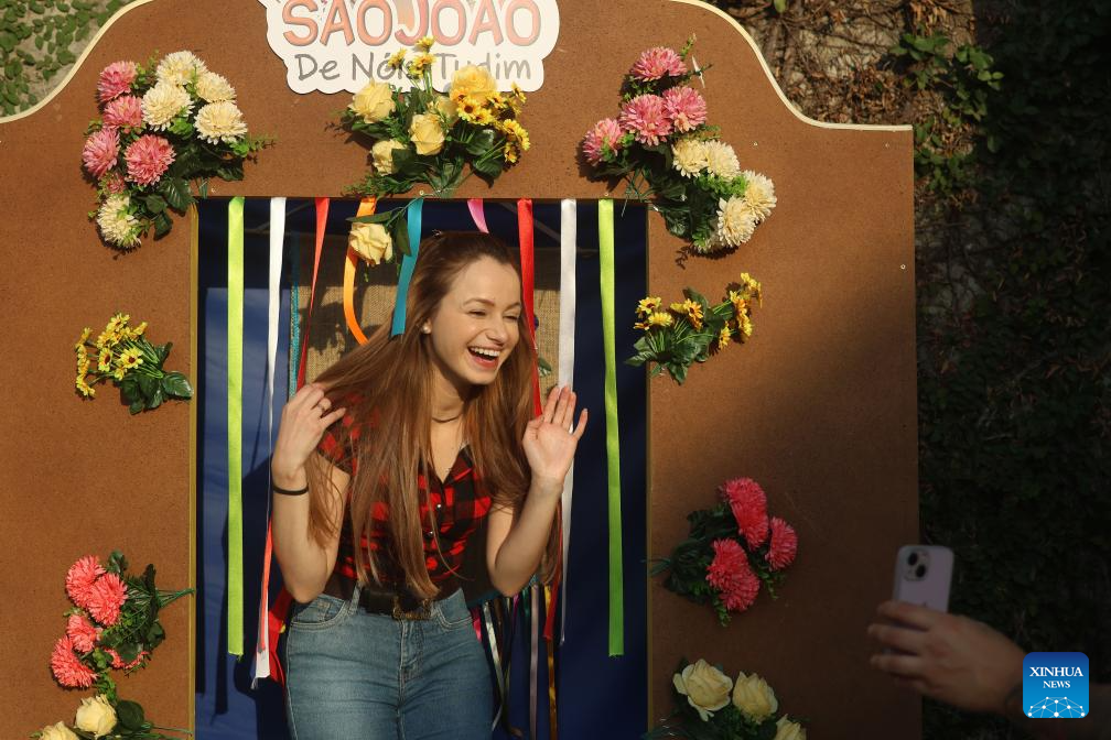 SAO PAULO, 9 junio, 2024 (Xinhua) -- Imagen del 8 de junio de 2024 de una mujer posando para fotografías durante el evento "Sao Joao de Nois Tudim" como parte de las celebraciones de la Fiesta de Junio llevadas a cabo en todo el país durante ese mes, en Sao Paulo, Brasil. (Xinhua/Rahel Patrasso)