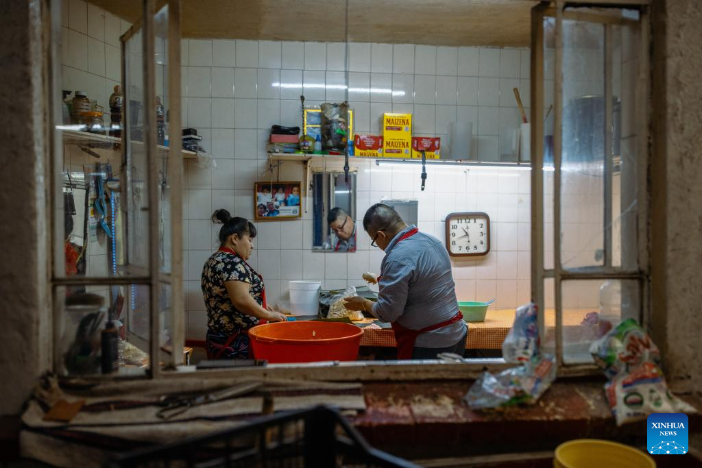 CIUDAD DE MEXICO, 9 junio, 2024 (Xinhua) -- Imagen del 6 de junio de 2024 del chef, Quirino Tolentino Castro (d), elaborando tamales oaxaqueños en el restaurante Tamales Tata, en la Ciudad de México, capital de México. Los tamales son un platillo popular en México. Como muchos otros alimentos en México, los tamales tienen sus orígenes hace cientos de años, mucho antes de la llegada de los españoles. Las comunidades indígenas de México disfrutaban de este alimento básico en sus dietas, hecho con harina de maíz rellena de carnes y salsas, envuelta y cocida al vapor en hojas de maíz u hojas de plátano. (Xinhua/Li Muzi)