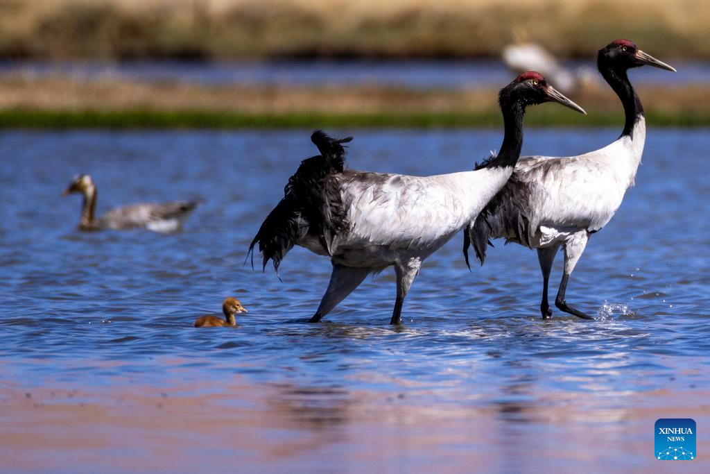 LHASA, 10 junio, 2024 (Xinhua) -- Imagen del 9 de junio de 2024 de dos grullas de cuello negro y su polluelo vistos en un humedal, en el distrito de Xainza de la ciudad de Nagqu, en la región autónoma de Xizang, en el suroeste de China. Las parejas de grullas de cuello negro están criando bebés en humedales a una altitud de unos 4.700 metros en el distrito de Xainza. Cada año, alrededor de junio, las parejas de grullas de cuello negro migran al distrito de Xainza para incubar huevos en pilares de hierba rodeados de agua. La grulla de cuello negro, una especie que se encuentra bajo protección estatal de primera clase en China, habita principalmente en praderas de meseta y pantanos a una altitud de entre 2.500 y 5.000 metros. (Xinhua/Jiang Fan)