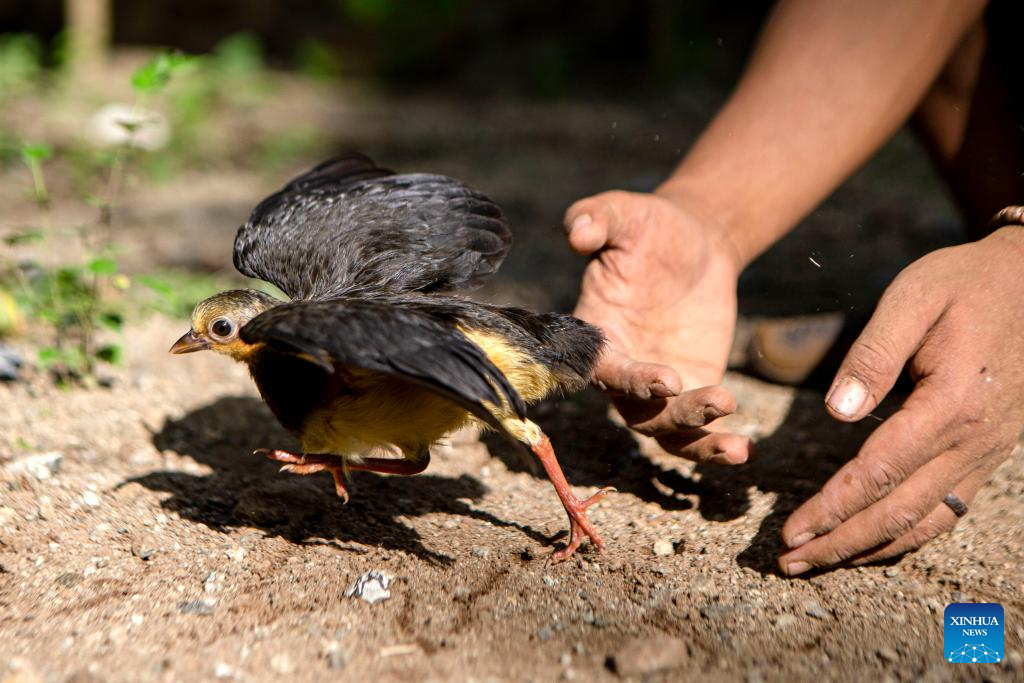 SULAWESI CENTRAL, 11 junio, 2024 (Xinhua) -- Imagen del 10 de junio de 2024 de un aldeano local liberando un polluelo de maleo en el Parque Nacional Lore Lindu, en Sulawesi Central, Indonesia. El maleo (Macrocephalon maleo) es endémico de la isla indonesia de Sulawesi y de la cercana isla de Buton, donde vive en bosques tropicales de tierras bajas y de montaña. Para proteger esta especie en peligro crítico, un grupo de aldeanos locales está creando un mejor entorno vital para el maleo construyendo hábitats e incubadoras cerca de sus lugares de anidación, recogiendo y protegiendo los huevos y liberando a los polluelos en la naturaleza. (Xinhua/Deden Isman)