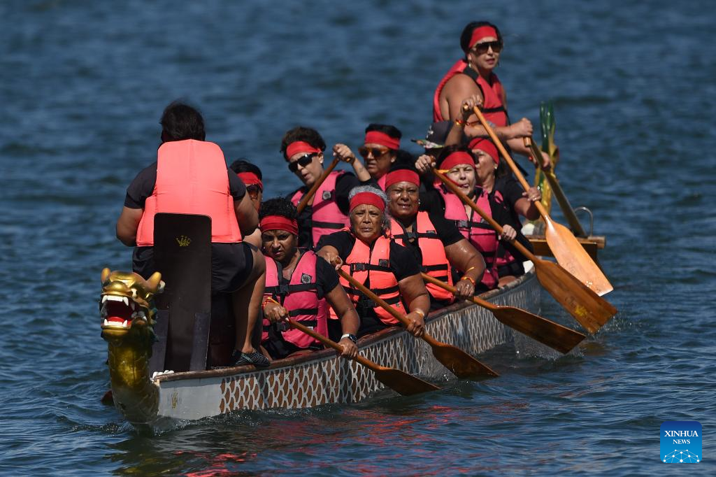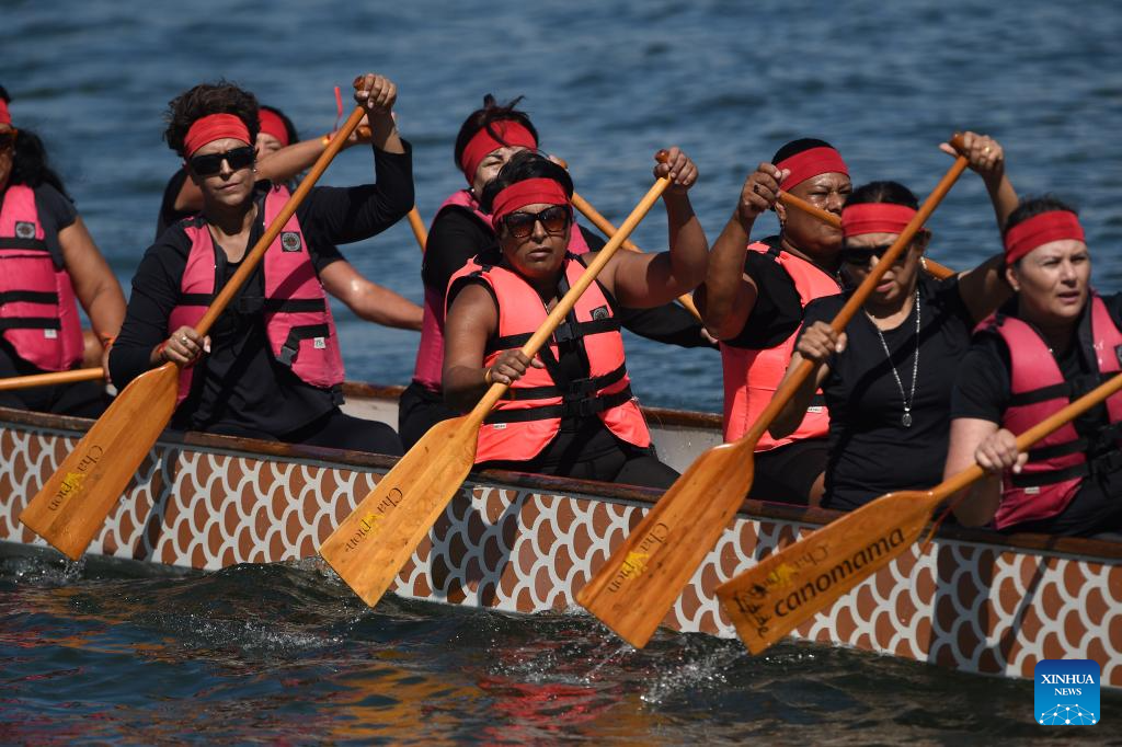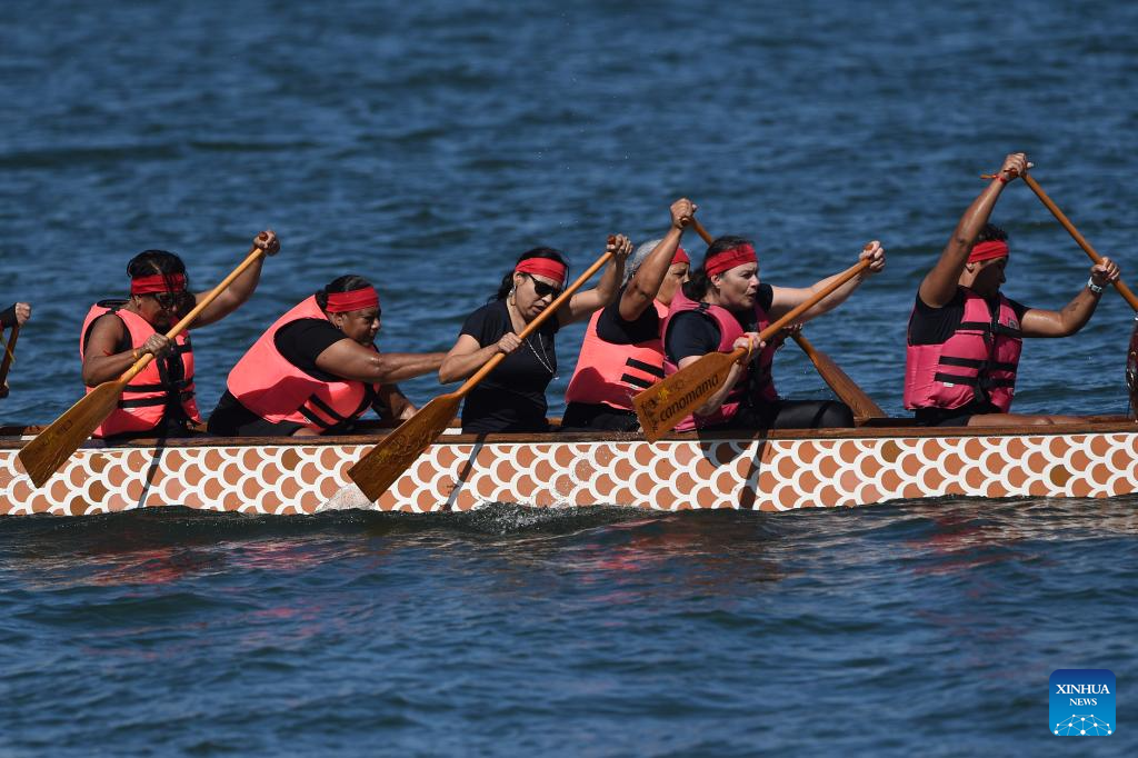 BRASILIA, 11 junio, 2024 (Xinhua) -- Mujeres sobrevivientes de cáncer de mama participan durante la celebración del Día del Bote del Dragón, en el lago Paranoá, en Brasilia, Brasil, el 11 de junio de 2024. (Xinhua/Lucio Tavora)