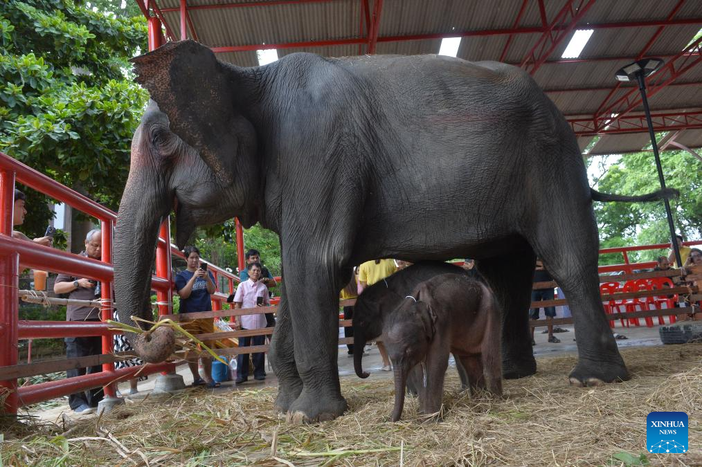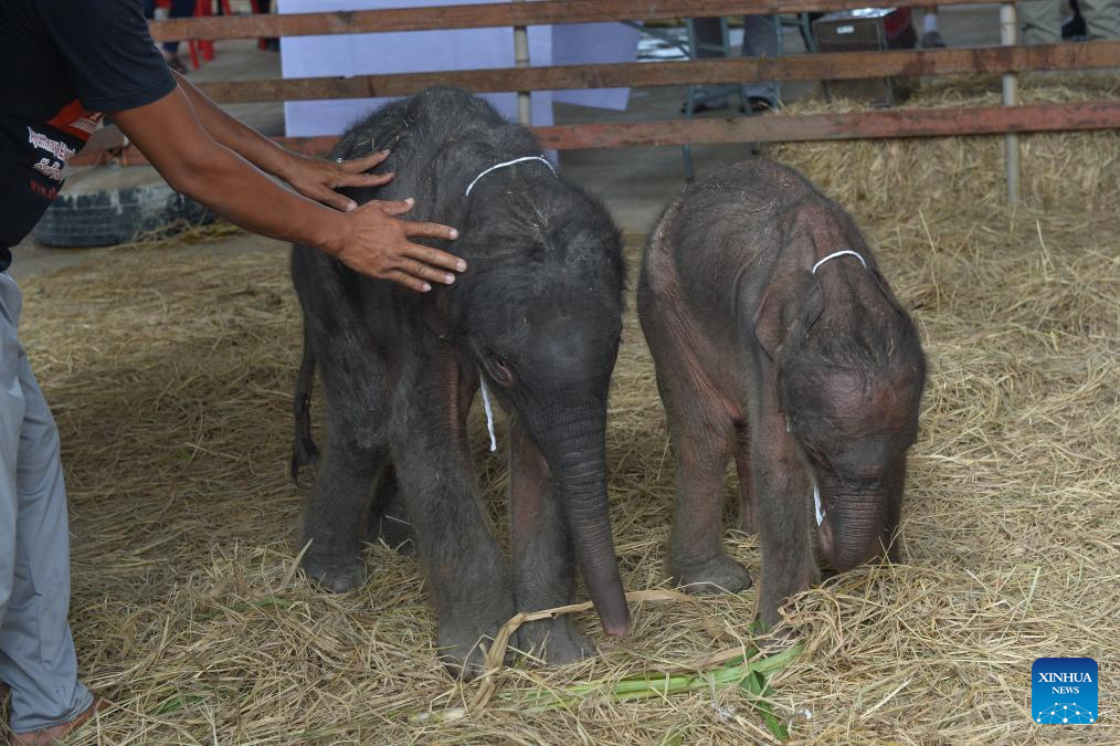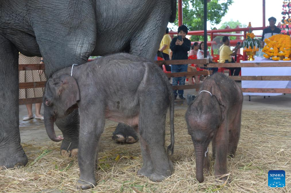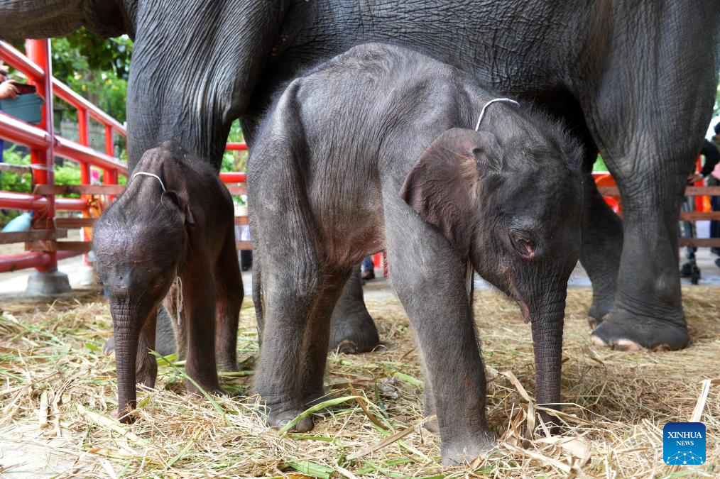 PROVINCIA DE AYUTTHAYA, 10 junio, 2024 (Xinhua) -- Bebés elefantes son vistos en la Aldea de Elefantes Phaniad Luang, en la provincia de Ayutthaya, Tailandia, el 10 de junio de 2024. Pangjamjuri, una elefanta de 36 años de edad, dio a luz a elefantes gemelos, un macho y una hembra, aquí en la tarde del 7 de junio. (Xinhua/Rachen Sageamsak)