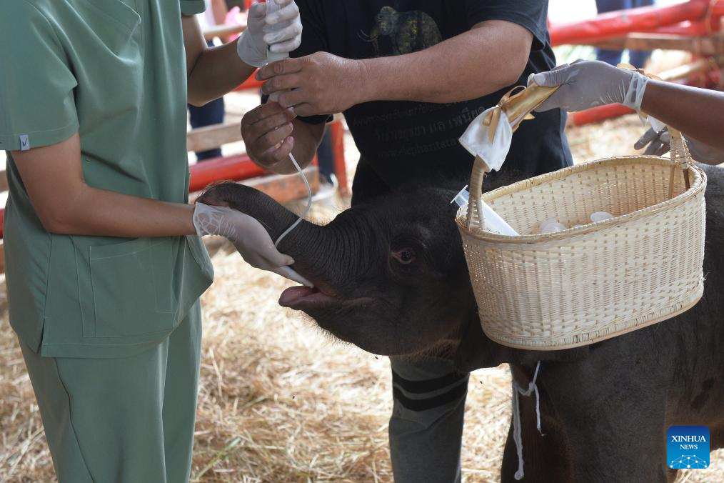 PROVINCIA DE AYUTTHAYA, 10 junio, 2024 (Xinhua) -- Empleados alimentan con leche a un bebé elefante en la Aldea de Elefantes Phaniad Luang, en la provincia de Ayutthaya, Tailandia, el 10 de junio de 2024. Pangjamjuri, una elefanta de 36 años de edad, dio a luz a elefantes gemelos, un macho y una hembra, aquí en la tarde del 7 de junio. (Xinhua/Rachen Sageamsak)