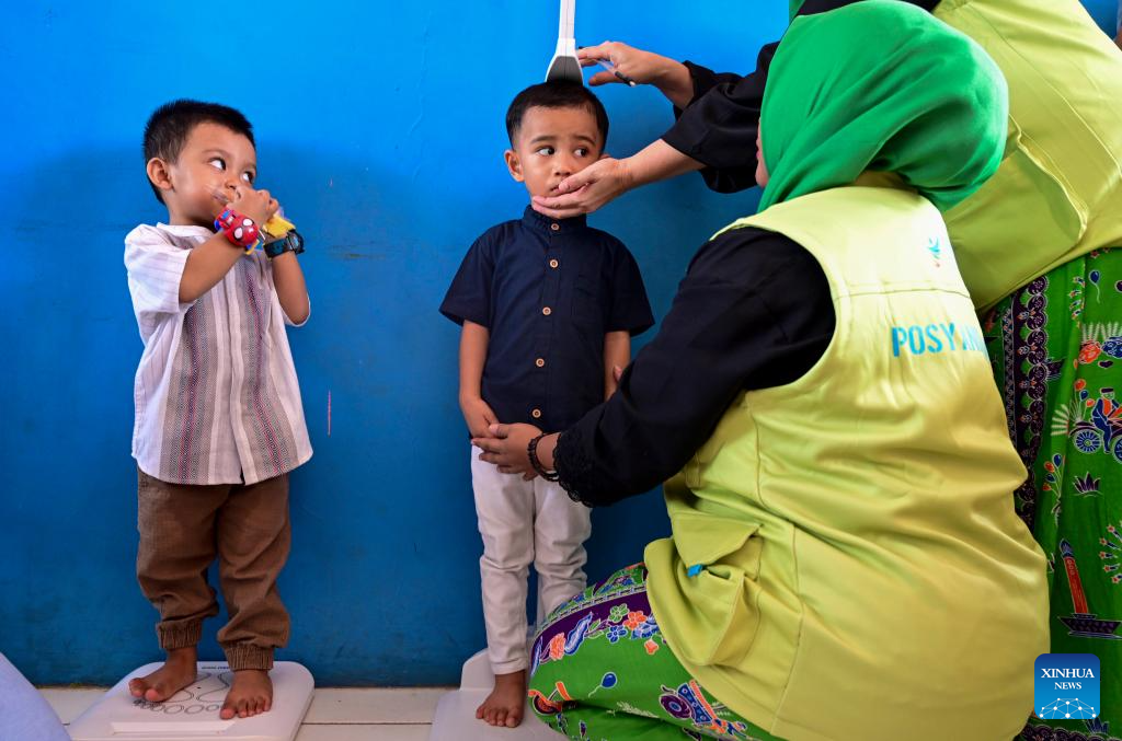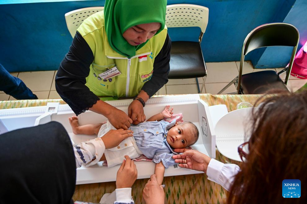 YAKARTA, 11 junio, 2024 (Xinhua) -- Empleadas miden la altura de un niño durante un programa de prevención del retraso del crecimiento infantil, en Yakarta, Indonesia, el 11 de junio de 2024. (Xinhua/Zulkarnain)