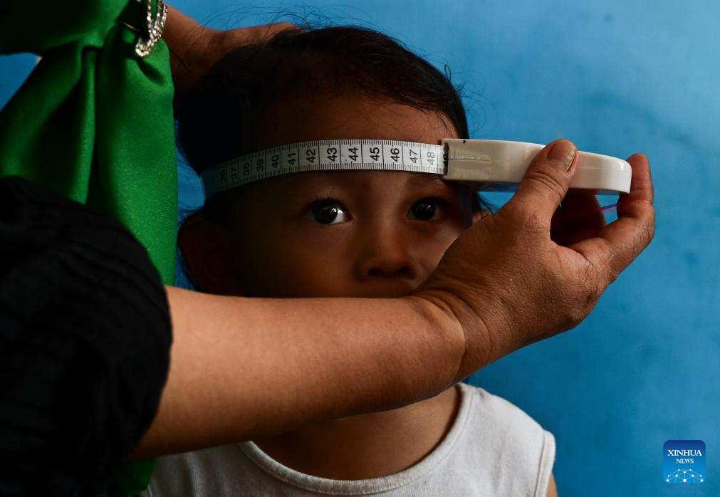 YAKARTA, 11 junio, 2024 (Xinhua) -- Una empleada mide el perímetro craneal de un niño durante un programa de prevención del retraso del crecimiento infantil, en Yakarta, Indonesia, el 11 de junio de 2024. (Xinhua/Zulkarnain)