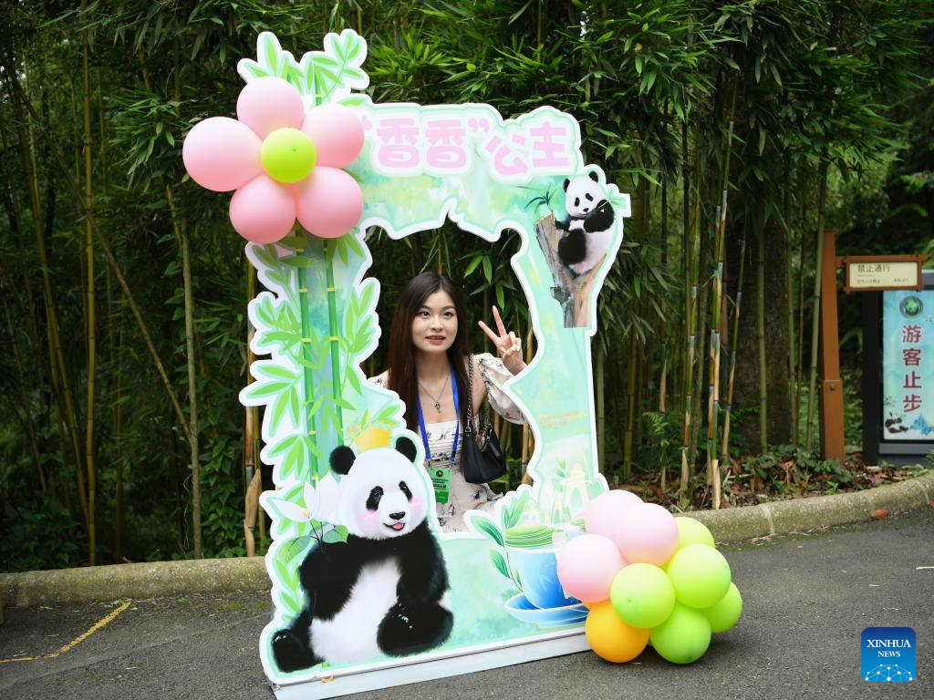 CHENGDU, 12 junio, 2024 (Xinhua) -- Una turista posa para fotografías con un marco decorativo para el cumpleaños de la panda gigante, Xiang Xiang, en la base Ya'an del Centro de Conservación e Investigación para Pandas Gigantes de China, en la provincia de Sichuan, en el suroeste de China, el 12 de junio de 2024. Muchos visitantes asistieron a la base Ya'an del Centro de Conservación e Investigación del Panda Gigante de China en la provincia de Sichuan, en el suroeste de China, para celebrar el séptimo cumpleaños de la panda gigante hembra, Xiang Xiang, el miércoles. Xiang Xiang nació en el Zoológico de Ueno, en Tokio, Japón, el 12 de junio de 2017 de Shin Shin (hembra) y Ri Ri (macho), dos pandas gigantes prestados por China, país al que pertenece la propiedad de los cachorros procreados por la pareja. La panda partió del Zoológico de Ueno, el 21 de febrero de 2023 y voló de regreso a China, su país de origen. (Xinhua/Xu Bingjie)