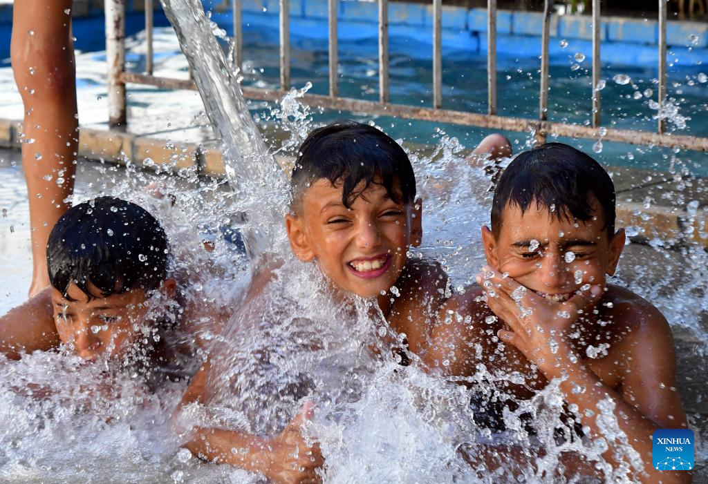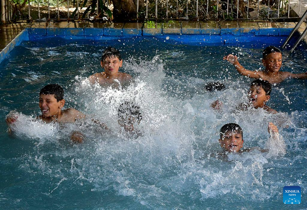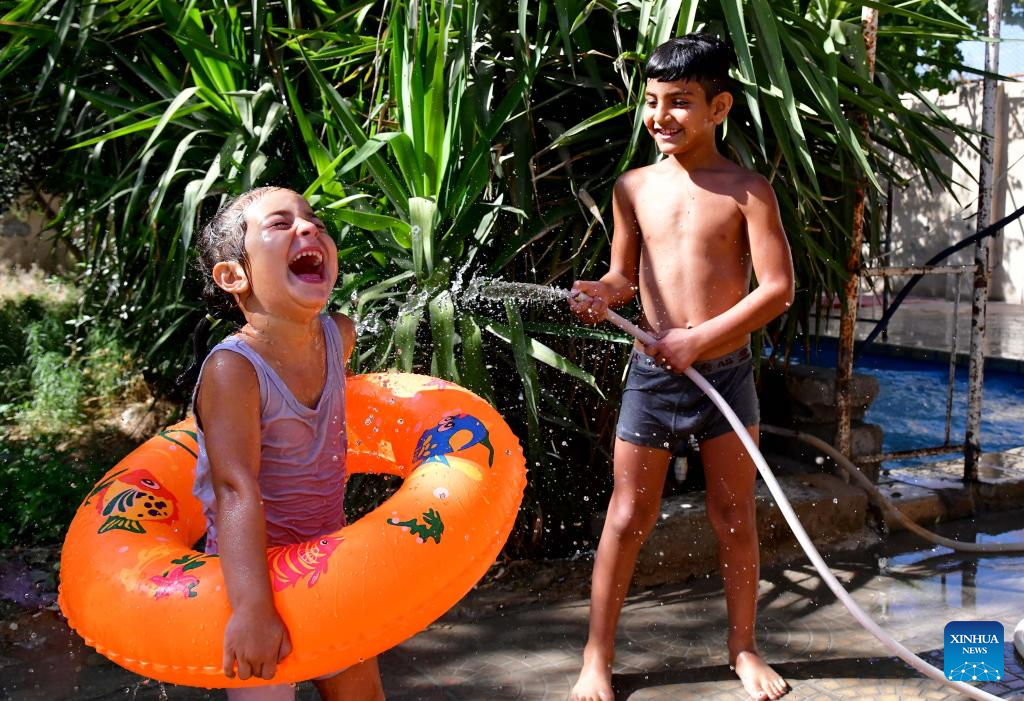 DAMASCO, 12 junio, 2024 (Xinhua) -- Imagen del 11 de junio de 2024 de niños divirtiéndose en el agua en una pequeña piscina, en Damasco, Siria. (Xinhua/Ammar Safarjalani)
