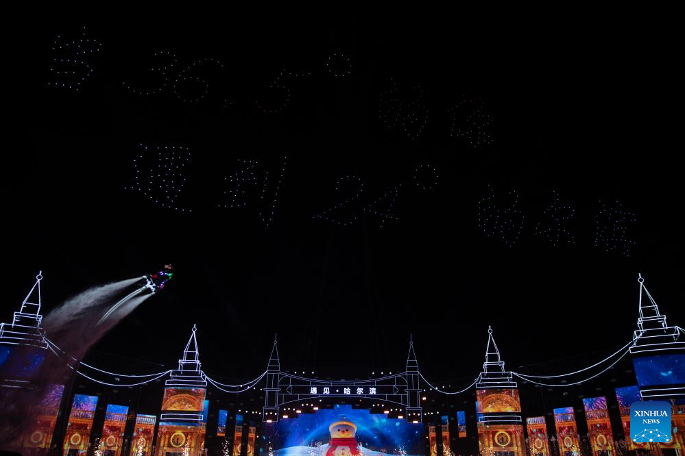 HARBIN, 12 junio, 2024 (Xinhua) -- Imagen aérea tomada con un dron el 10 de junio de 2024 de la presentación en vivo "Encuentro con Harbin" puesta en escena a lo largo del río Songhua, en Harbin, en la provincia de Heilongjiang, en el noreste de China. (Xinhua/Zhang Tao)
