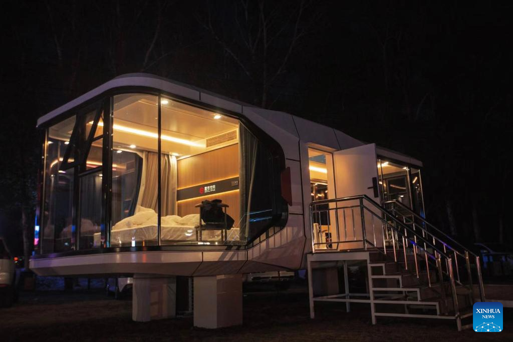 HARBIN, 13 junio, 2024 (Xinhua) -- Imagen del 1 de mayo de 2024 del alojamiento de cápsula espacial en la Base de Acampada Bukui Yunhe, en Qiqihar, en la provincia de Heilongjiang, en el noreste de China. Los vastos pantanos, lagos y exuberantes cañaverales que atraen anualmente a miles de aves migratorias a la frontera norte de China ahora atraen a los entusiastas campistas a pasar una noche o dos en medio del abrazo de la naturaleza. (Xinhua)