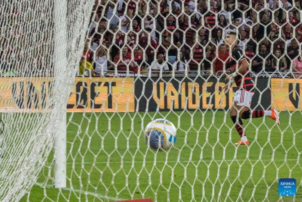 RIO DE JANEIRO, 14 junio, 2024 (Xinhua) -- Imagen del 13 de junio de 2024 del jugador Luiz Araújo, de Flamengo, festejando su anotación durante el partido correspondiente a la jornada 8 del Campeonato Brasileño Serie A, ante Gremio, celebrado en el Estadio Maracaná, en Río de Janeiro, Brasil. (Xinhua/Claudia Martini)
