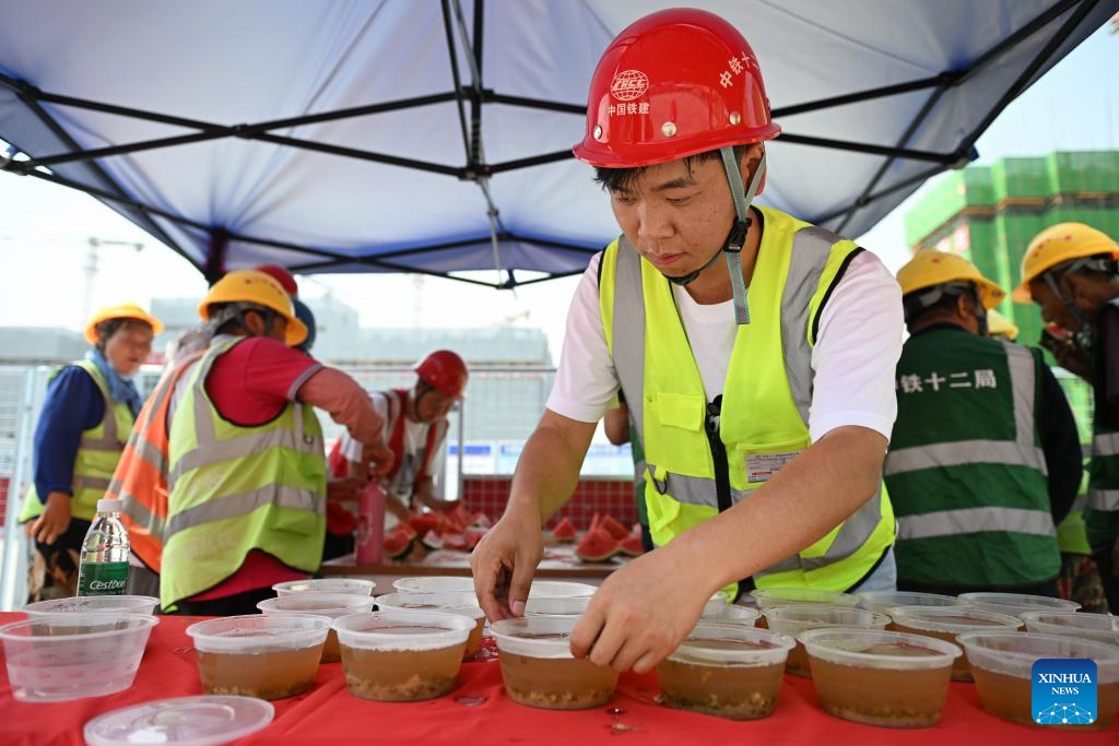 XIONG'AN, 14 junio, 2024 (Xinhua) -- Imagen del 13 de junio de 2024 de un empleado preparando sopa de frijoles mungo para los trabajadores en un sitio de construcción, en la Nueva Area de Xiong'an, en la provincia de Hebei, en el norte de China. Con las olas de calor que han azotado las partes centro y el sur de la provincia de Hebei en los últimos días, las empresas constructoras han tomado medidas de prevención de insolación para los trabajadores al aire libre en la Nueva Area de Xiong'an. (Xinhua/Mu Yu)