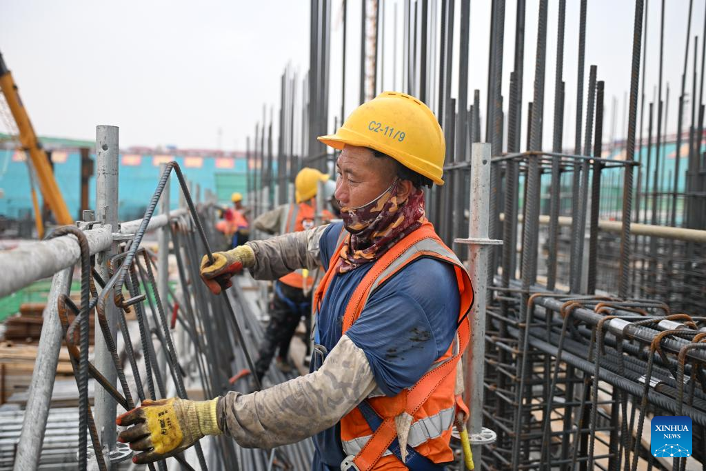 XIONG'AN, 14 junio, 2024 (Xinhua) -- Imagen del 13 de junio de 2024 de trabajadores laborando a altas temperaturas en un sitio de construcción, en la Nueva Area de Xiong'an, en la provincia de Hebei, en el norte de China. Con las olas de calor que han azotado las partes centro y el sur de la provincia de Hebei en los últimos días, las empresas constructoras han tomado medidas de prevención de insolación para los trabajadores al aire libre en la Nueva Area de Xiong'an. (Xinhua/Mu Yu)