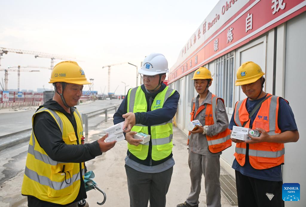 XIONG'AN, 14 junio, 2024 (Xinhua) -- Imagen del 13 de junio de 2024 de un empleado distribuyendo medicamentos para prevenir la insolación a los trabajadores en un sitio de construcción, en la Nueva Area de Xiong'an, en la provincia de Hebei, en el norte de China. Con las olas de calor que han azotado las partes centro y el sur de la provincia de Hebei en los últimos días, las empresas constructoras han tomado medidas de prevención de insolación para los trabajadores al aire libre en la Nueva Area de Xiong'an. (Xinhua/Mu Yu)