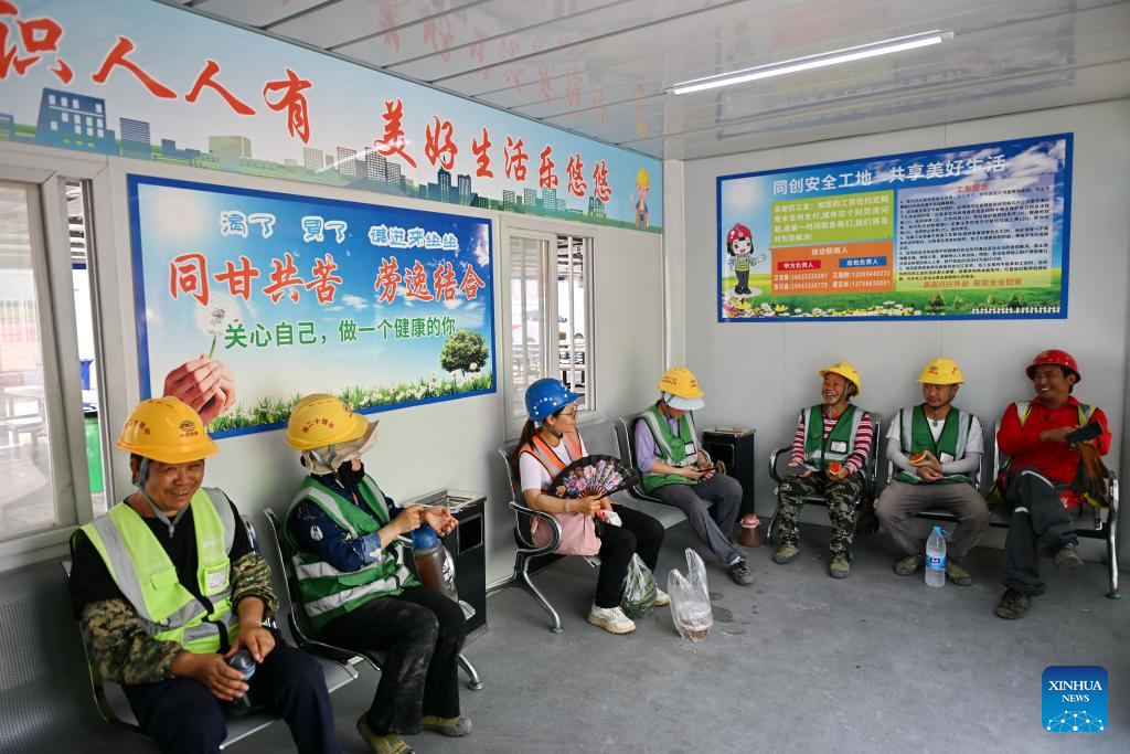 XIONG'AN, 14 junio, 2024 (Xinhua) -- Imagen del 13 de junio de 2024 de trabajadores de la construcción disfrutando de su tiempo de descanso en una estación de descanso, en la Nueva Area de Xiong'an, en la provincia de Hebei, en el norte de China. Con las olas de calor que han azotado el centro y el sur de la provincia de Hebei en los últimos días, las empresas constructoras han tomado medidas de prevención de insolación para los trabajadores al aire libre en la Nueva Area de Xiong'an. (Xinhua/Mu Yu)