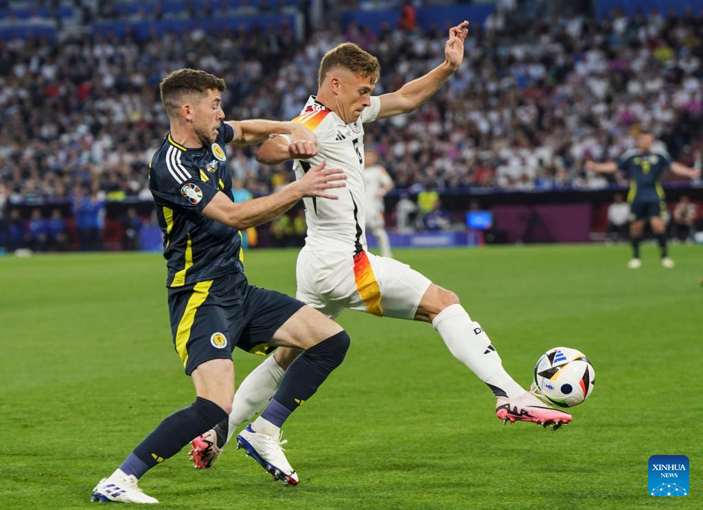 MUNICH, 15 junio, 2024 (Xinhua) -- Imagen del 14 de junio de 2024 de Joshua Kimmich (d), de Alemania, compitiendo durante el partido correspondiente al Grupo A de la Euro 2024 de la UEFA entre Alemania y Escocia, en Múnich, Alemania. (Xinhua/Peng Ziyang)