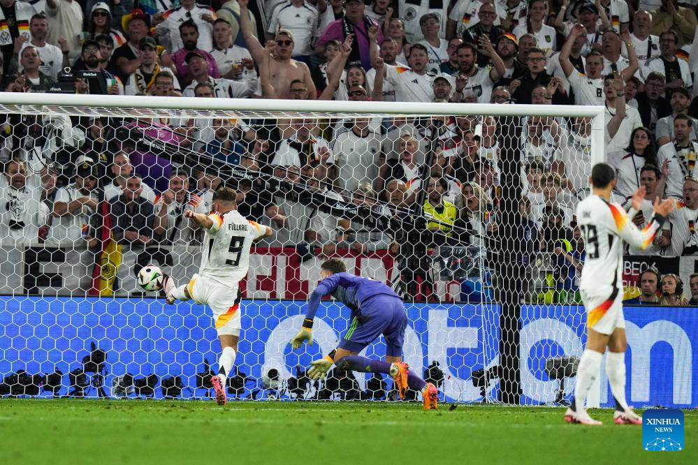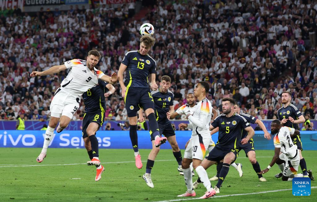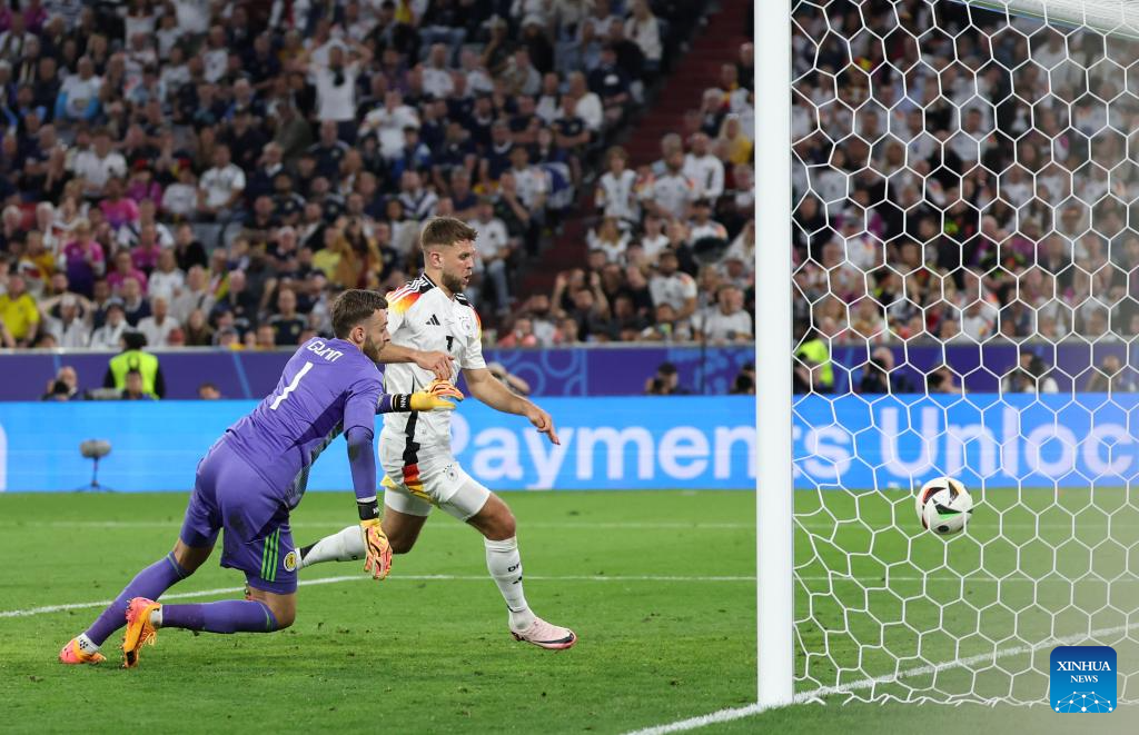 MUNICH, 15 junio, 2024 (Xinhua) -- Imagen del 14 de junio de 2024 de Niclas Fullkrug (i), de Alemania, disparando para anotar durante el partido correspondiente al Grupo A de la Euro 2024 de la UEFA entre Alemania y Escocia, en Múnich, Alemania. (Xinhua/Peng Ziyang)
