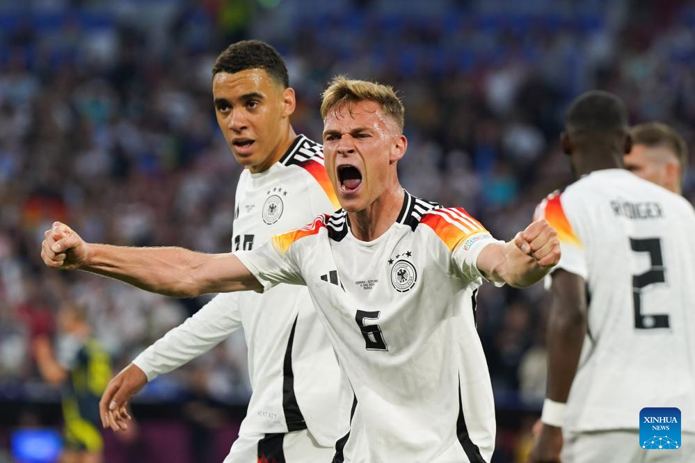MUNICH, 15 junio, 2024 (Xinhua) -- Imagen del 14 de junio de 2024 de Joshua Kimmich (frente), de Alemania, festejando durante el partido correspondiente al Grupo A de la Euro 2024 de la UEFA entre Alemania y Escocia, en Múnich, Alemania. (Xinhua/Peng Ziyang)