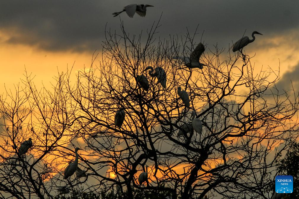LHOKSEUMAWE, 13 junio, 2024 (Xinhua) -- Imagen del 12 de junio de 2024 de una parvada de garcetas posándose sobre árboles de manglares al atardecer, en Lhokseumawe, en la provincia de Aceh, Indonesia. (Xinhua/Fachrul Reza)