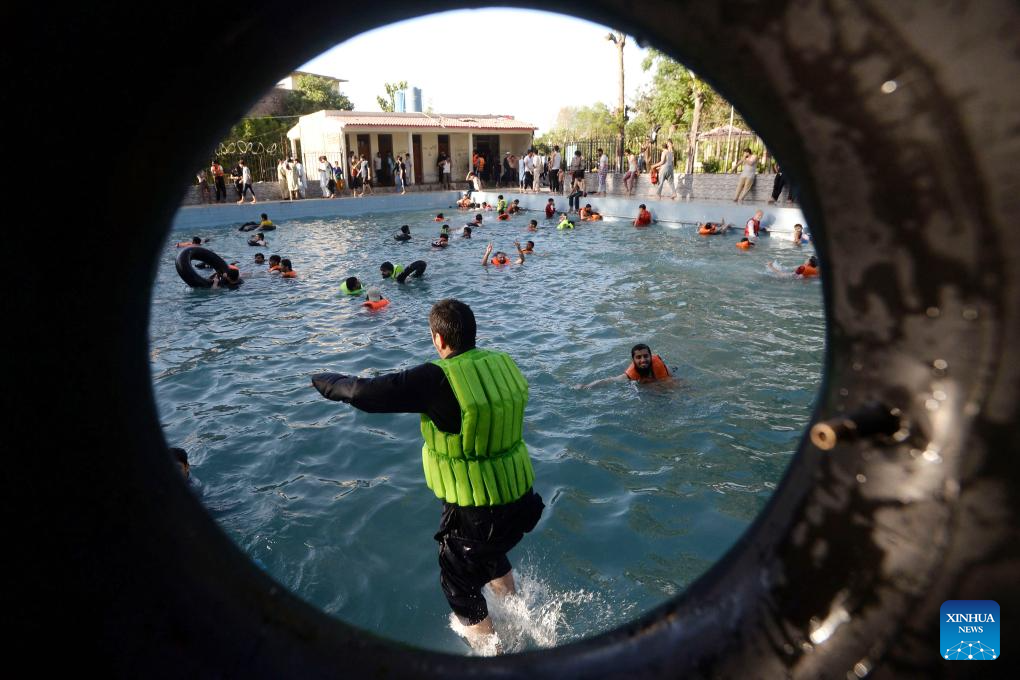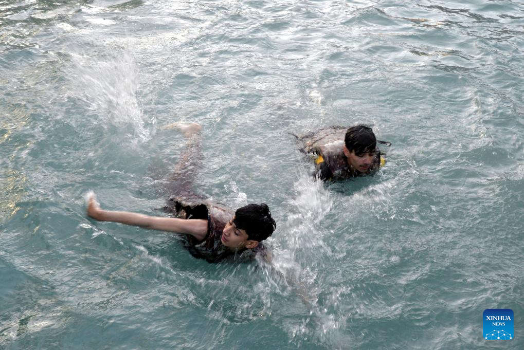 PESHAWAR, 15 junio, 2024 (Xinhua) -- Personas nadan para escapar del calor del verano, en Peshawar, en el noroeste de Pakistán, el 15 de junio de 2024. (Xinhua/Umar Qayyum)
