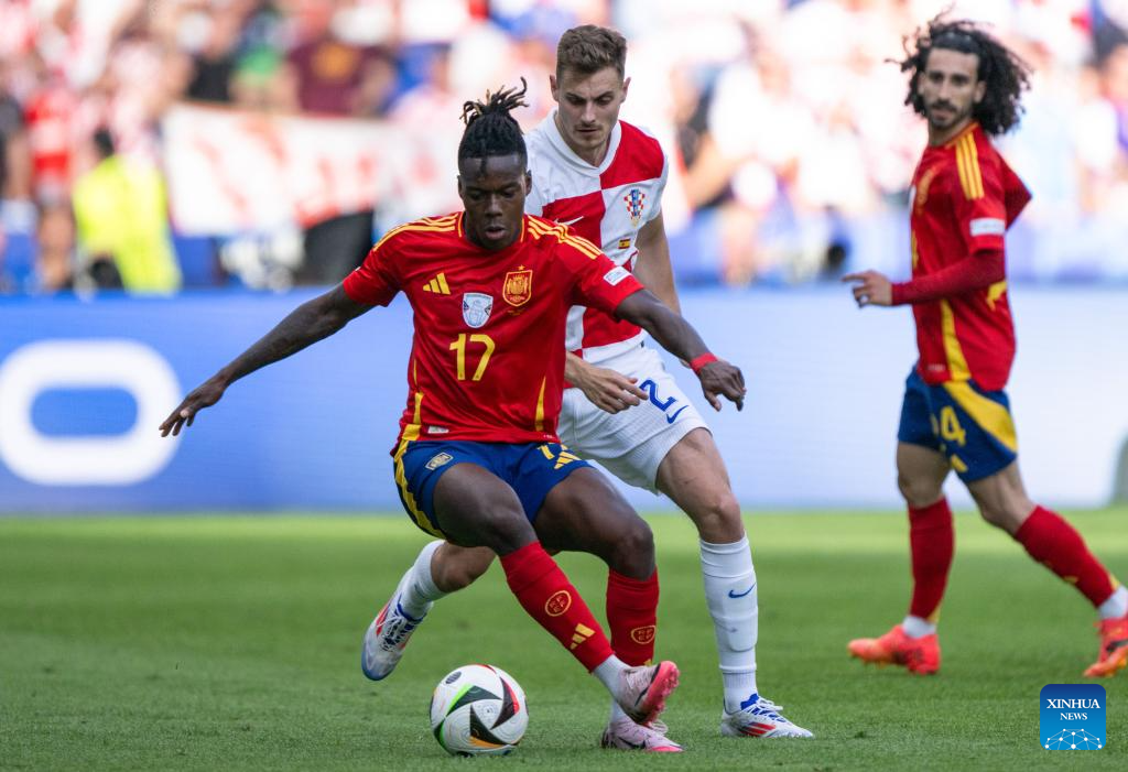 BERLIN, 16 junio, 2024 (Xinhua) -- Imagen del 15 de junio de 2024 de Nico Williams (i), de España, controlando el balón durante el partido del Grupo B de la EURO 2024 de la UEFA entre España y Croacia, en Berlín, Alemania. (Xinhua/Xiao Yijiu)