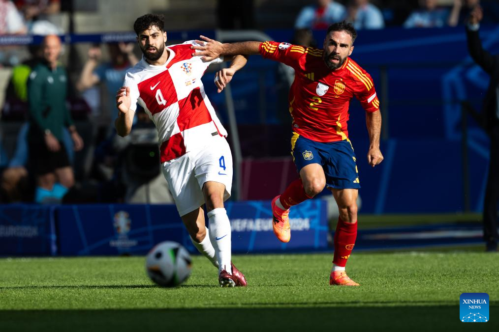 BERLIN, 16 junio, 2024 (Xinhua) -- Imagen del 15 de junio de 2024 de Josko Gvardiol (i), de Croacia, disputando el balón con Daniel Carvajal Ramos, de España, durante el partido del Grupo B de la EURO 2024 de la UEFA entre España y Croacia, en Berlín, Alemania. (Xinhua/Xiao Yijiu)
