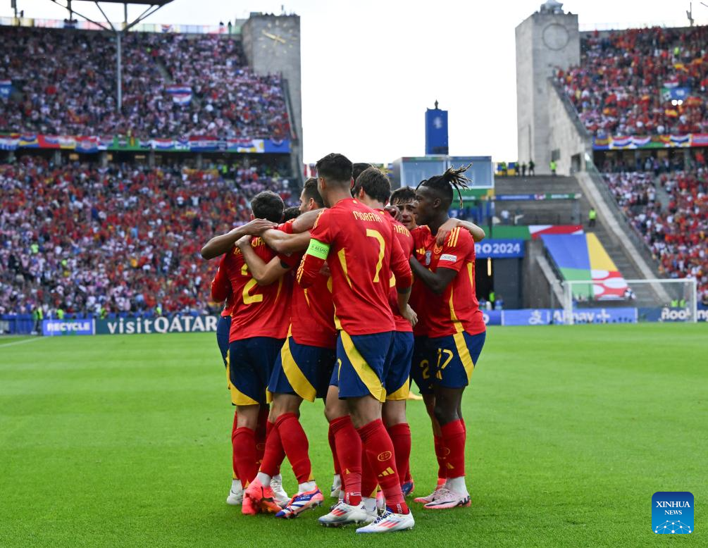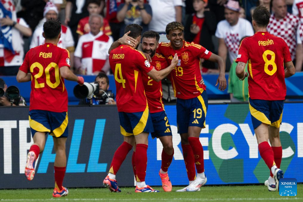 BERLIN, 16 junio, 2024 (Xinhua) -- Imagen del 15 de junio de 2024 de jugadores de España, festejando una anotación durante el partido del Grupo B de la EURO 2024 de la UEFA entre España y Croacia, en Berlín, Alemania. (Xinhua/Ren Pengfei)