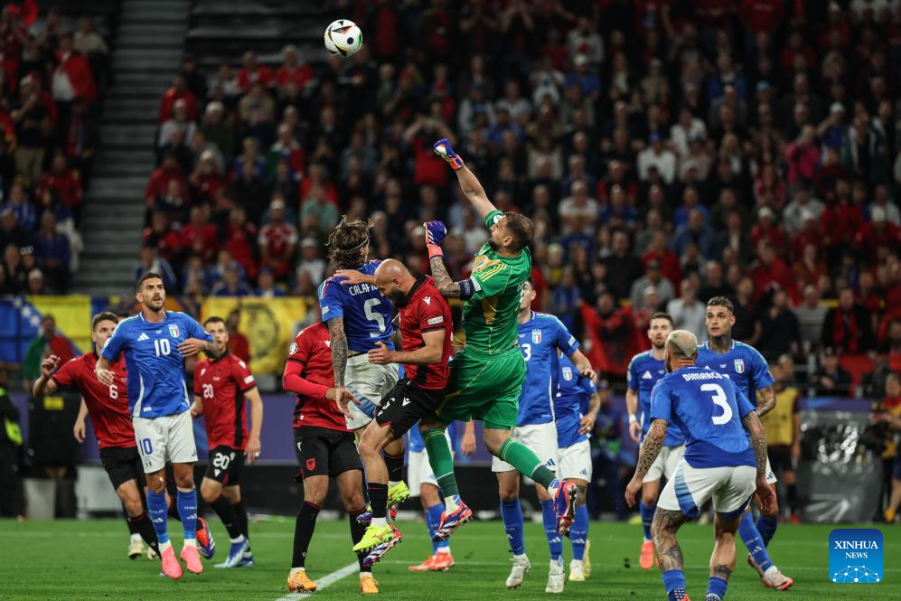 DORTMUND, 16 junio, 2024 (Xinhua) -- Imagen del 15 de junio de 2024 del guardameta, Gianluigi Donnarumma (d-arriba), de Italia, atajando el balón durante el partido del Grupo B de la EURO 2024 de la UEFA entre Italia y Albania, en Dortmund, Alemania. (Xinhua/Pan Yulong)