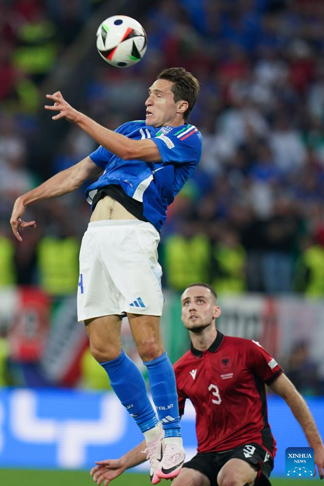 DORTMUND, 16 junio, 2024 (Xinhua) -- Imagen del 15 de junio de 2024 de Federico Chiesa (i), de Italia, saltando para cabecear el balón durante el partido del Grupo B de la EURO 2024 de la UEFA entre Italia y Albania, en Dortmund, Alemania. (Xinhua/Peng Ziyang)