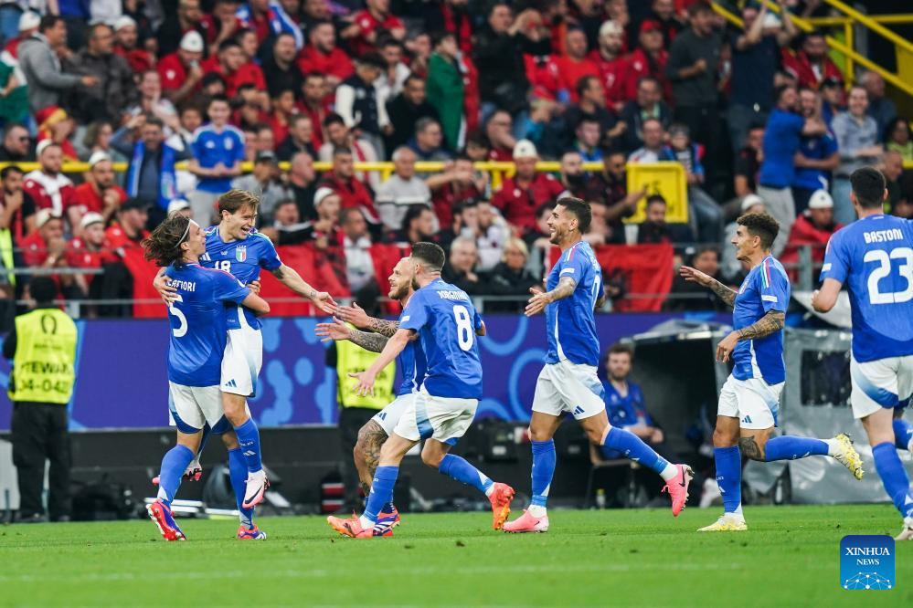DORTMUND, 16 junio, 2024 (Xinhua) -- Imagen del 15 de junio de 2024 de jugadores de Italia festejando una anotación durante el partido del Grupo B de la EURO 2024 de la UEFA entre Italia y Albania, en Dortmund, Alemania. (Xinhua/Peng Ziyang)