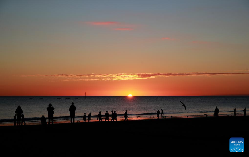 ADELAIDA, 16 junio, 2024 (Xinhua) -- Personas disfrutan del atardecer en la Playa Glenelg, en Adelaida, Australia, el 16 de junio de 2024. (Xinhua/Ma Ping)