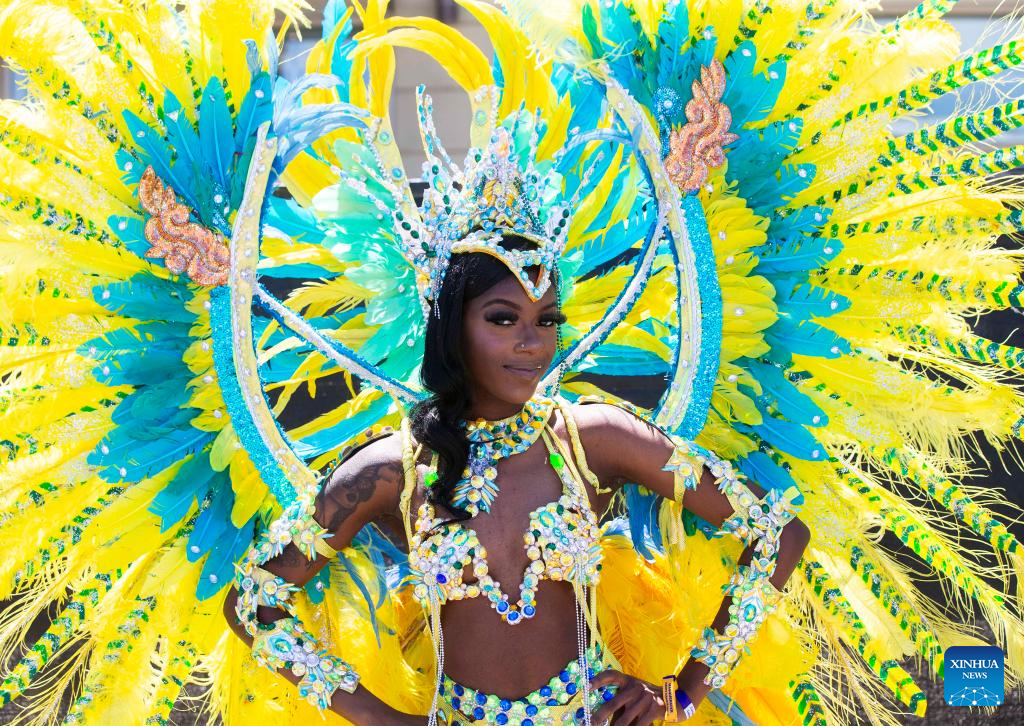 TORONTO, 16 junio, 2024 (Xinhua) -- Imagen del 15 de junio de 2024 de una juerguista disfrazada posando para fotografías durante el lanzamiento oficial del Carnaval Caribeño de Toronto 2024, en Toronto, Canadá. El evento se celebró aquí el sábado, marcando el inicio de una temporada festiva anual con vibrantes muestras de la cultura caribeña. (Xinhua/Zou Zheng)